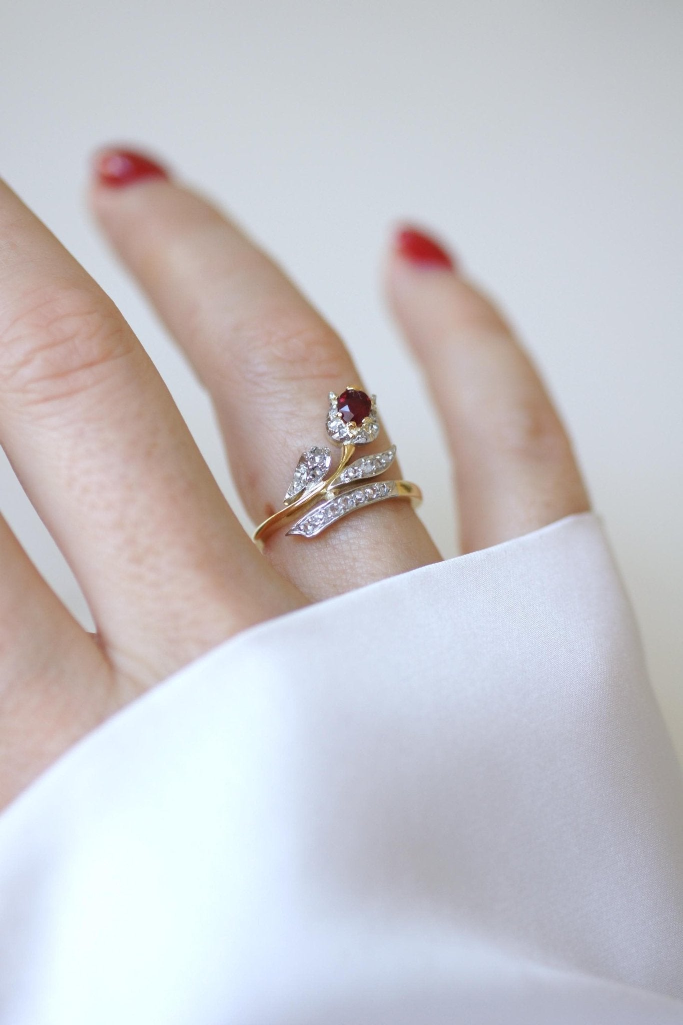 Bague ancienne en or jaune 18kt et platine (poinçon : tête d'aigle), représentant une tulipe ornée d'un rubis en son centre, pesant environ 0,30 Ct (origine probable: Siam), et de diamants taillés à en rose, dont le poids total est estimé pour environ 0,15 Ct.