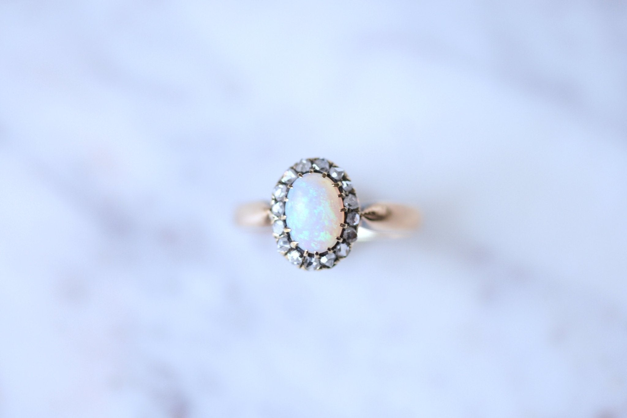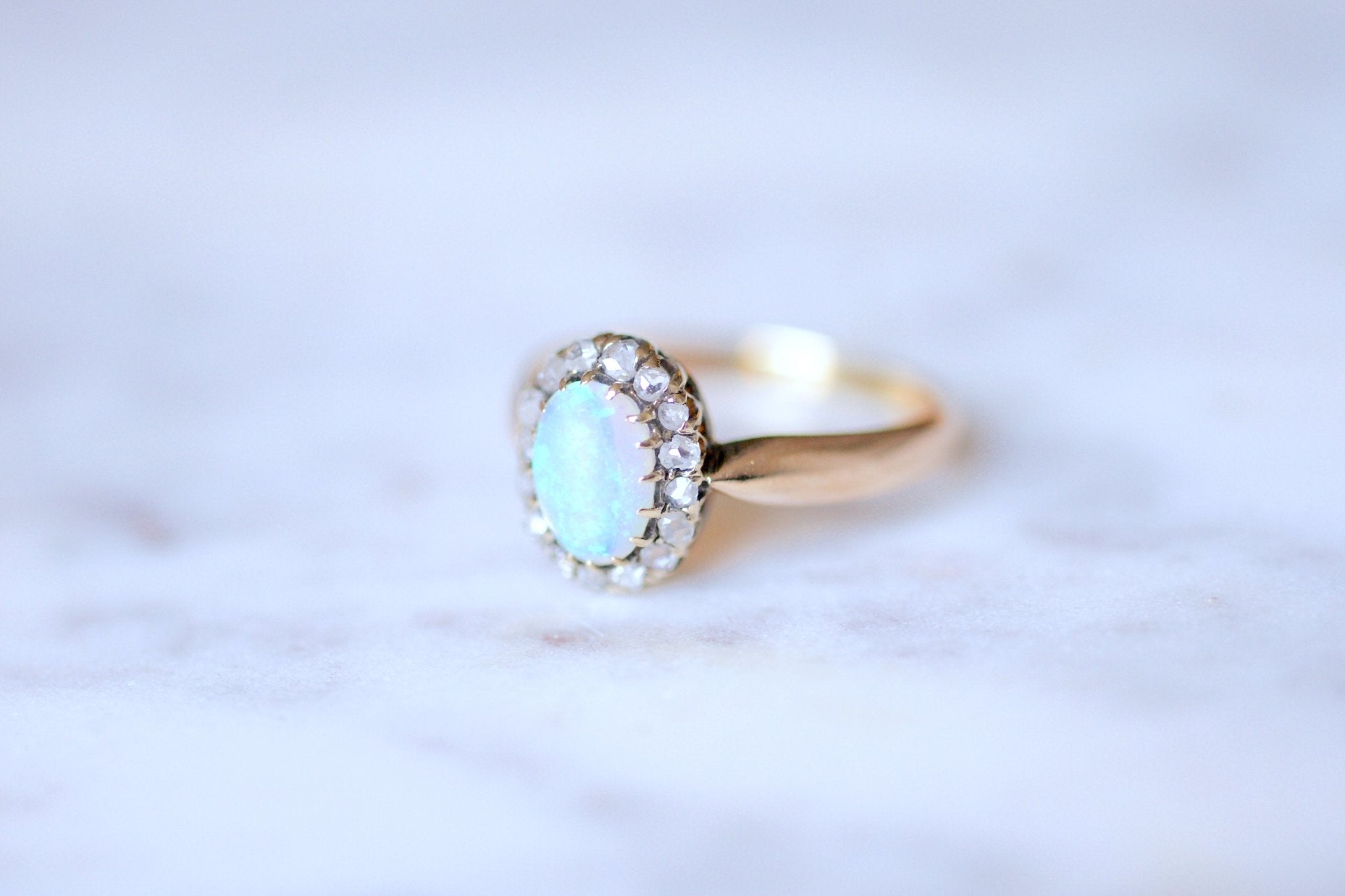 Bague ancienne Marguerite opale entourage diamants sur or