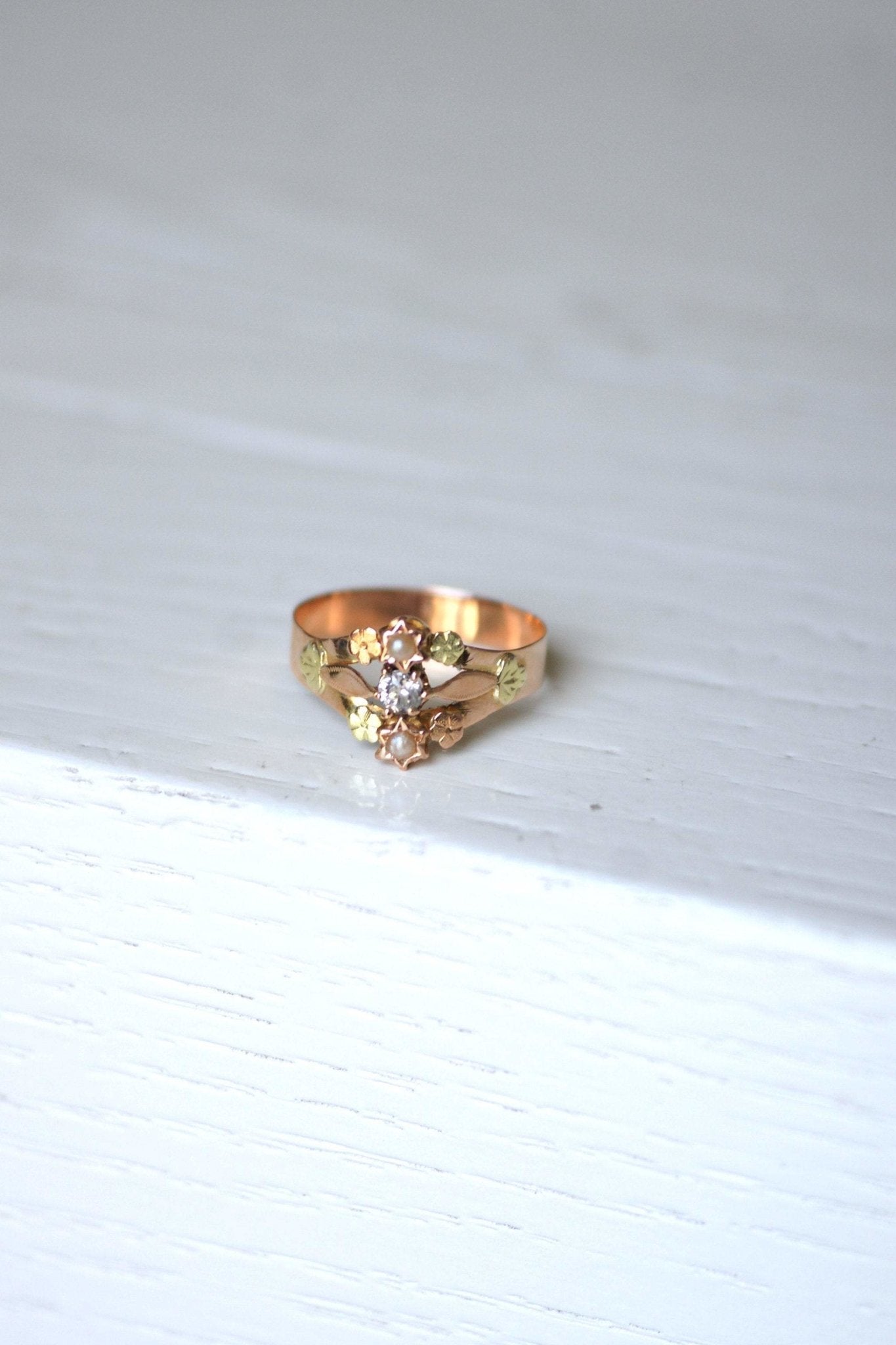Bague ancienne en or rose et jaune 18kt (poinçon tête de cheval), à motifs de fleurettes, et sertie d'un diamant taille ancienne pesant environ 0.15 Ct, et de deux perles fines.
