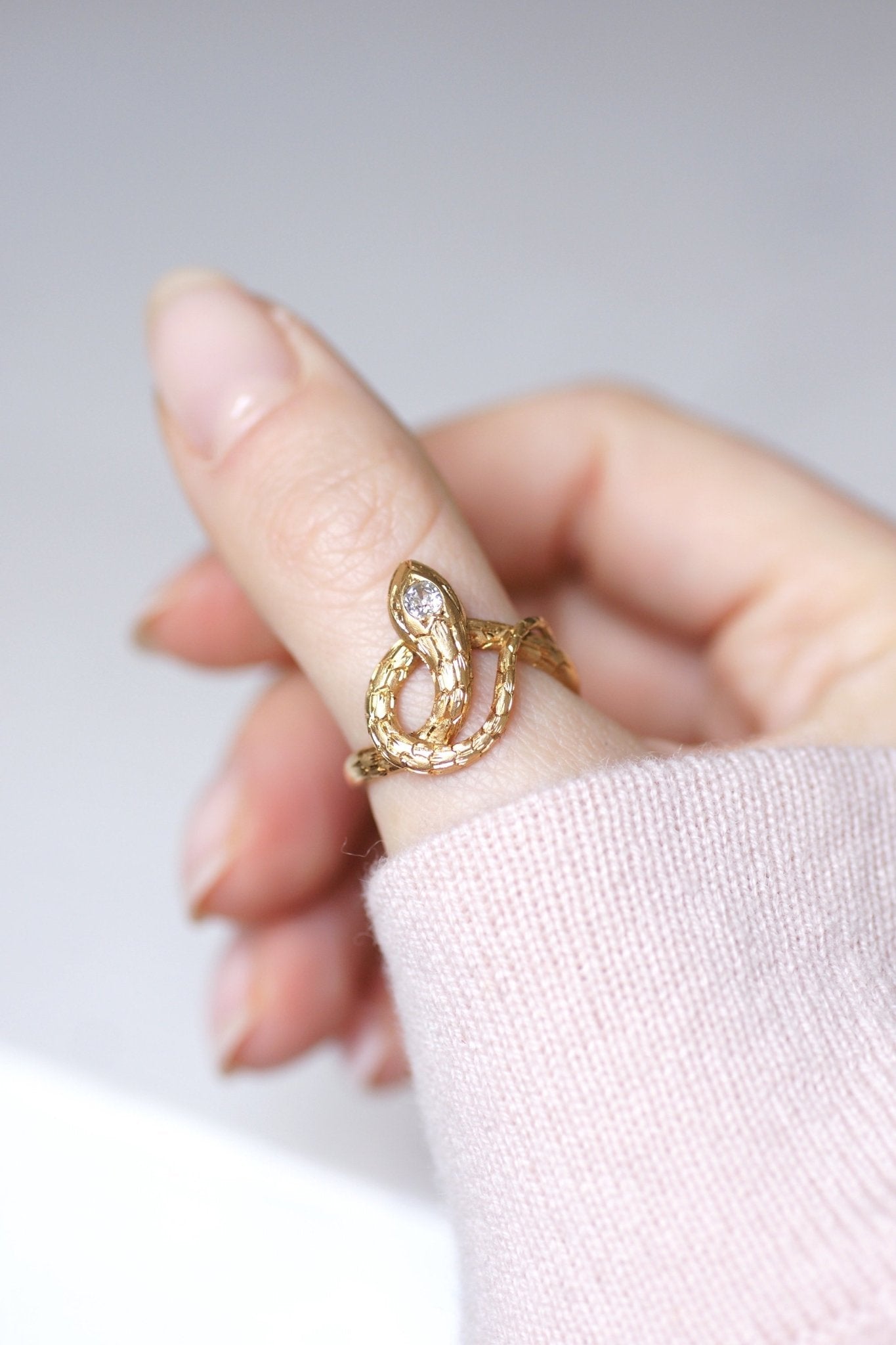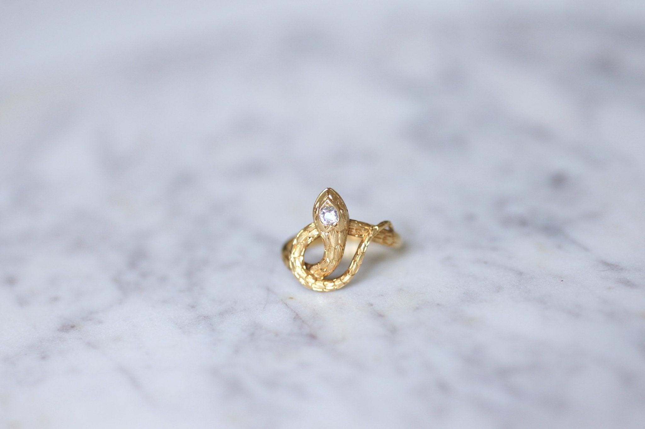 Cette bague ancienne illustrant un serpent enroulé sur lui même est une pièce unique rare et précieuse. Le serpent représente l’immortalité. Comme d’autres animaux, qui entrent sous terre, et en ressortent (par exemple le scarabée), les serpents sont symboles de Renaissance. Une bague en accord avec nos valeurs et notre volonté de donner une seconde vie aux bijoux anciens.