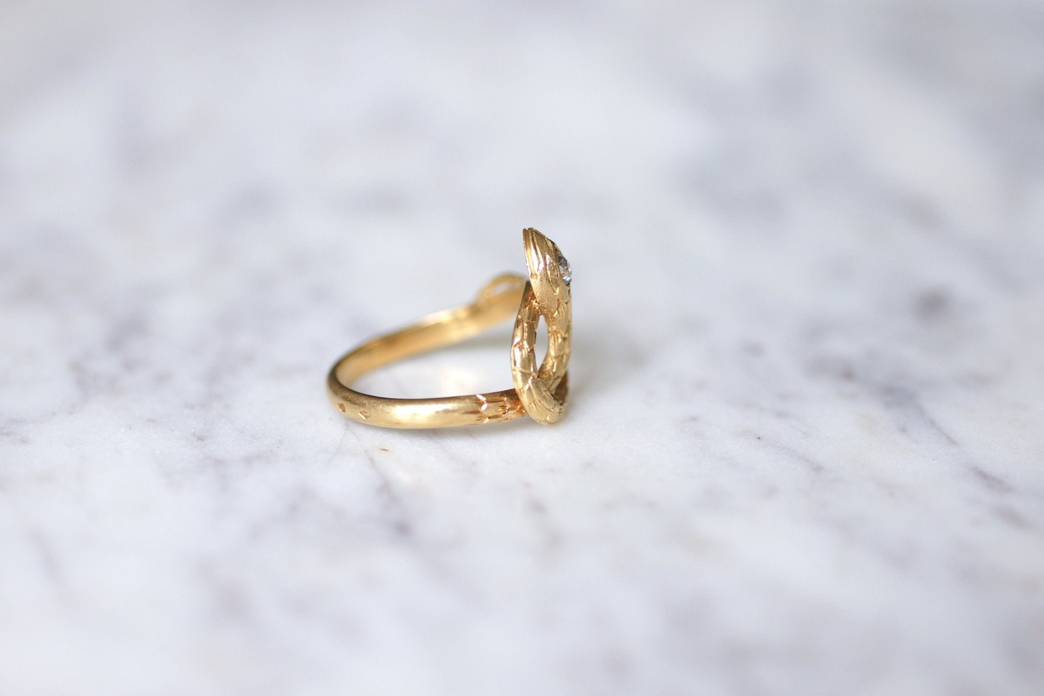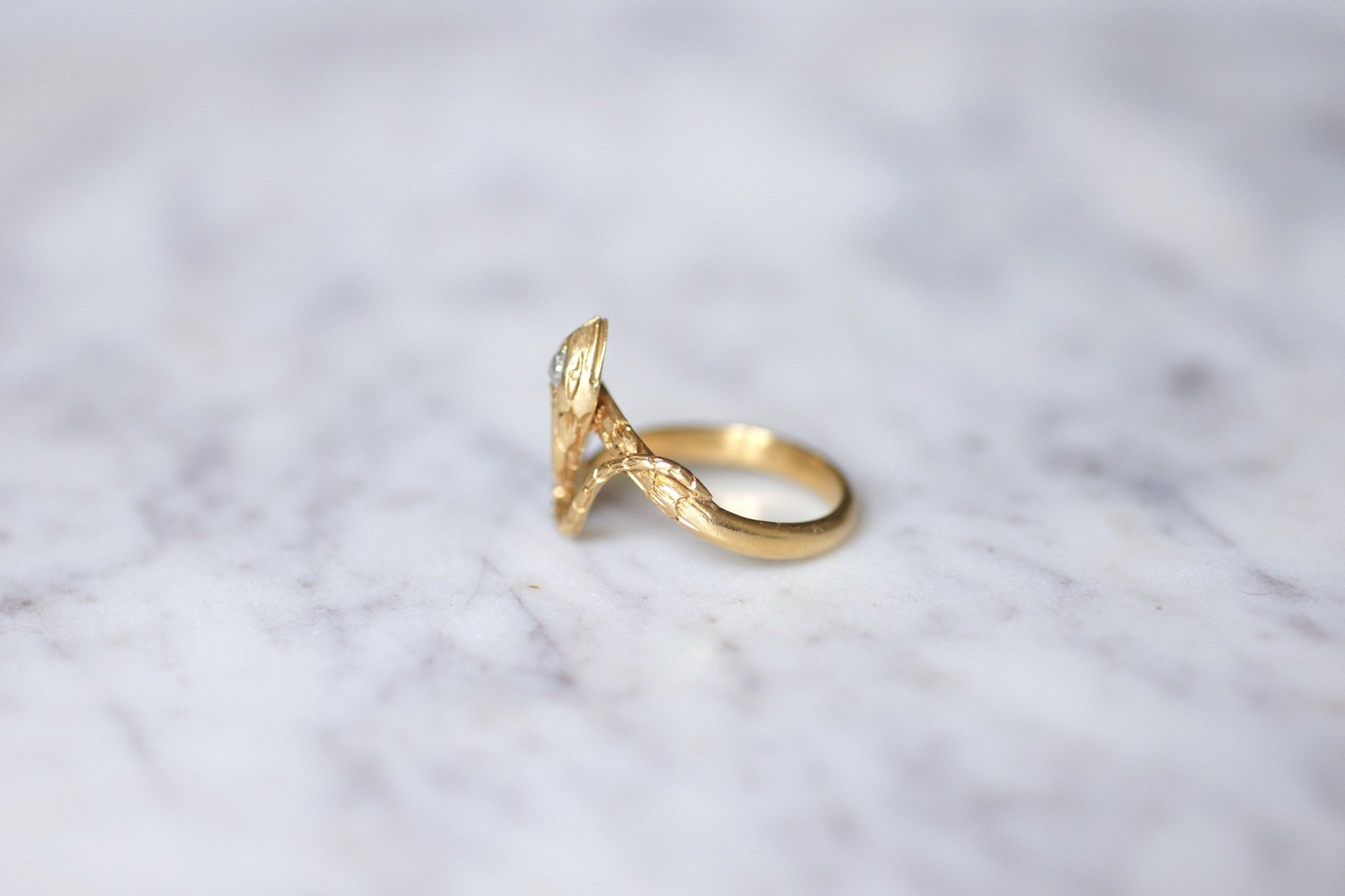 Bague ancienne serpent enroulé en or jaune 18kt (poinçon tête d'aigle) dont la tête est ornée d'un diamant taillé à l'ancienne coussin pesant environ 0.10Ct.