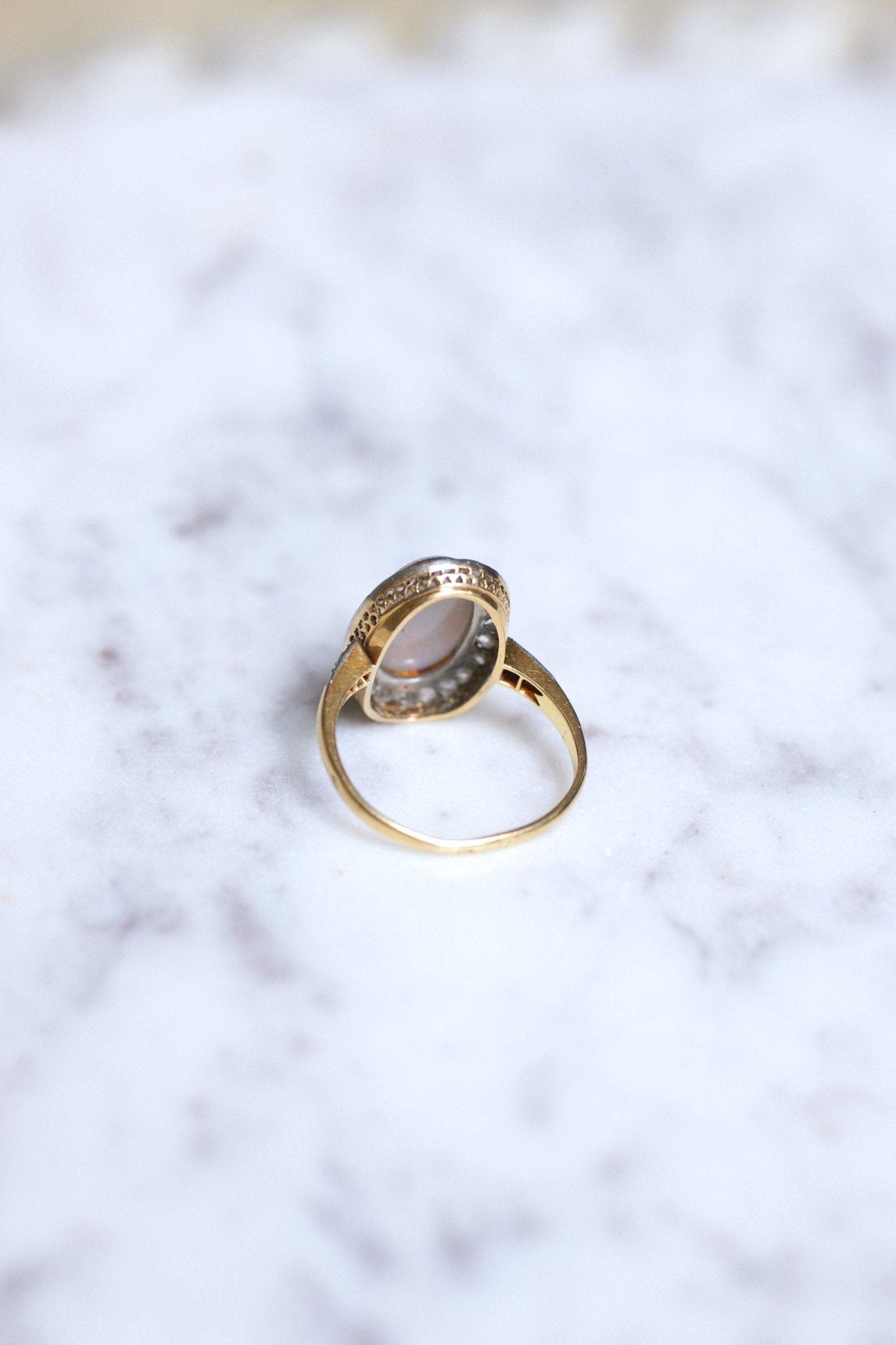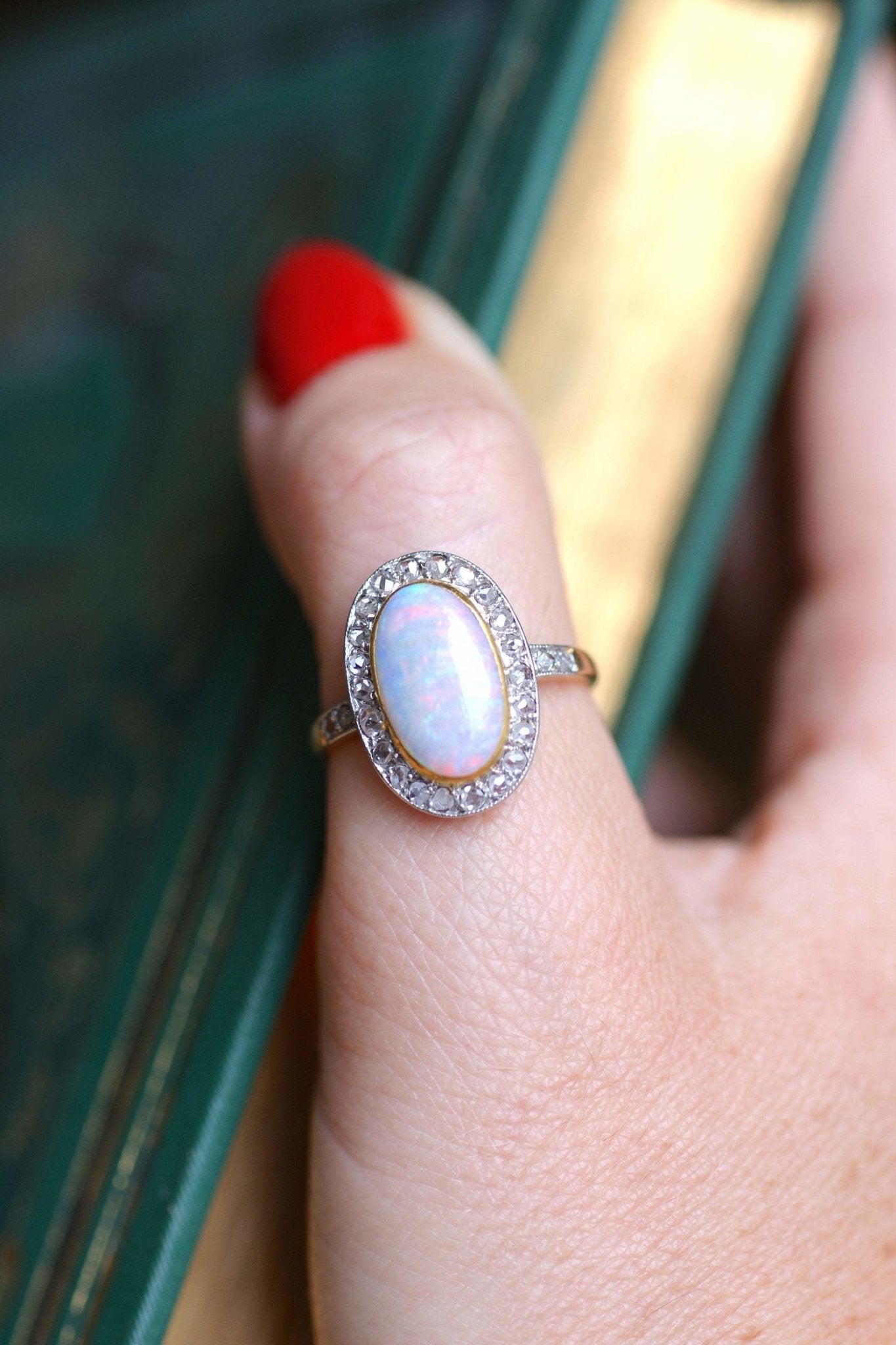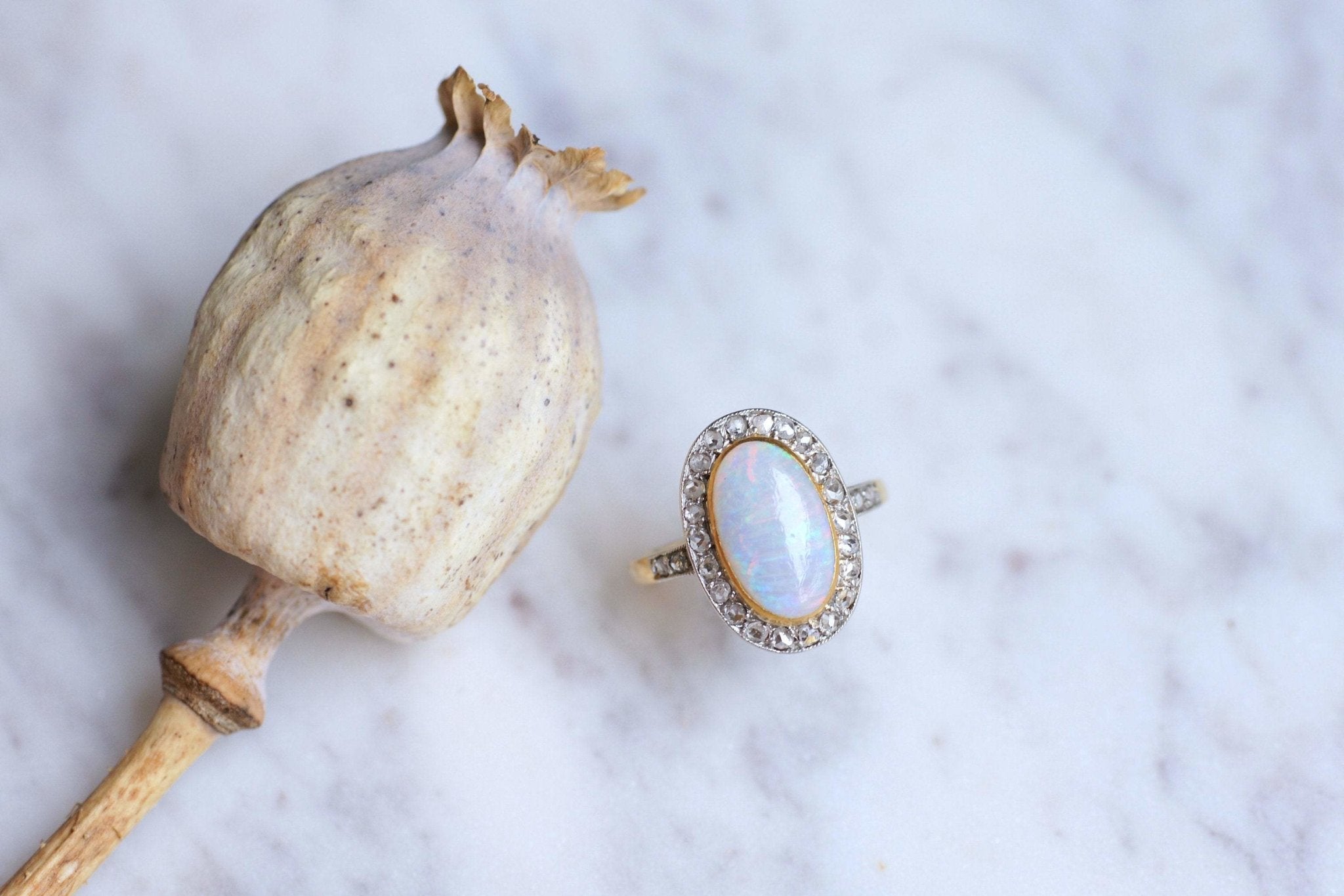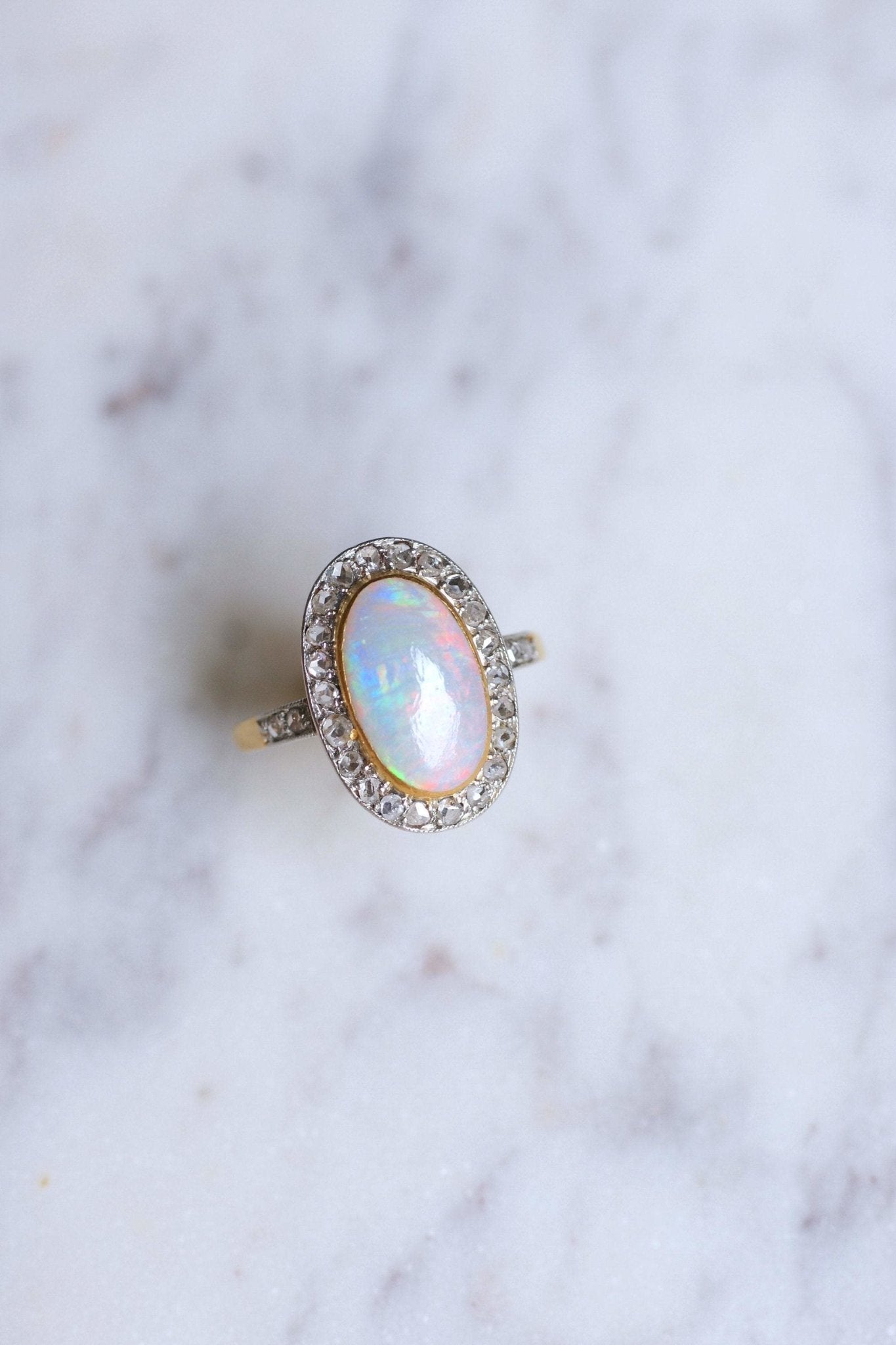 Bague pompadour ancienne en or jaune 18Kt et platine (poinçon tête d'aigle), dont le centre est orné d'un superbe cabochon d'opale pesant environ 2.00 Cts, dans un entourage de diamants taillés en rose.