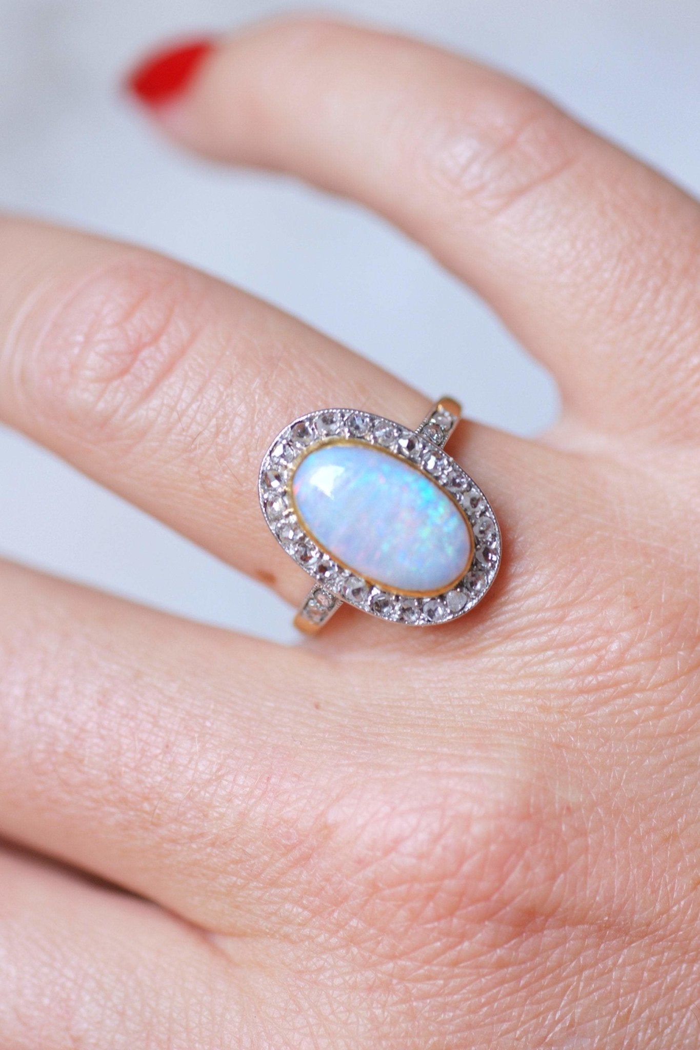 État: très légère usure du serti, très légères micro rayures sur les parties or et platine, et légère abrasion de l'opale, voir photos.