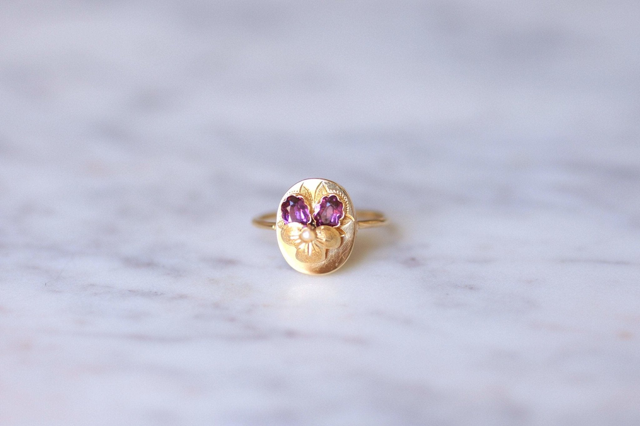 Bague en or jaune 18kt (poinçon: tête d'aigle) ornée d'une ravissante fleur de pensée dont deux pétales sont serties d'améthystes.