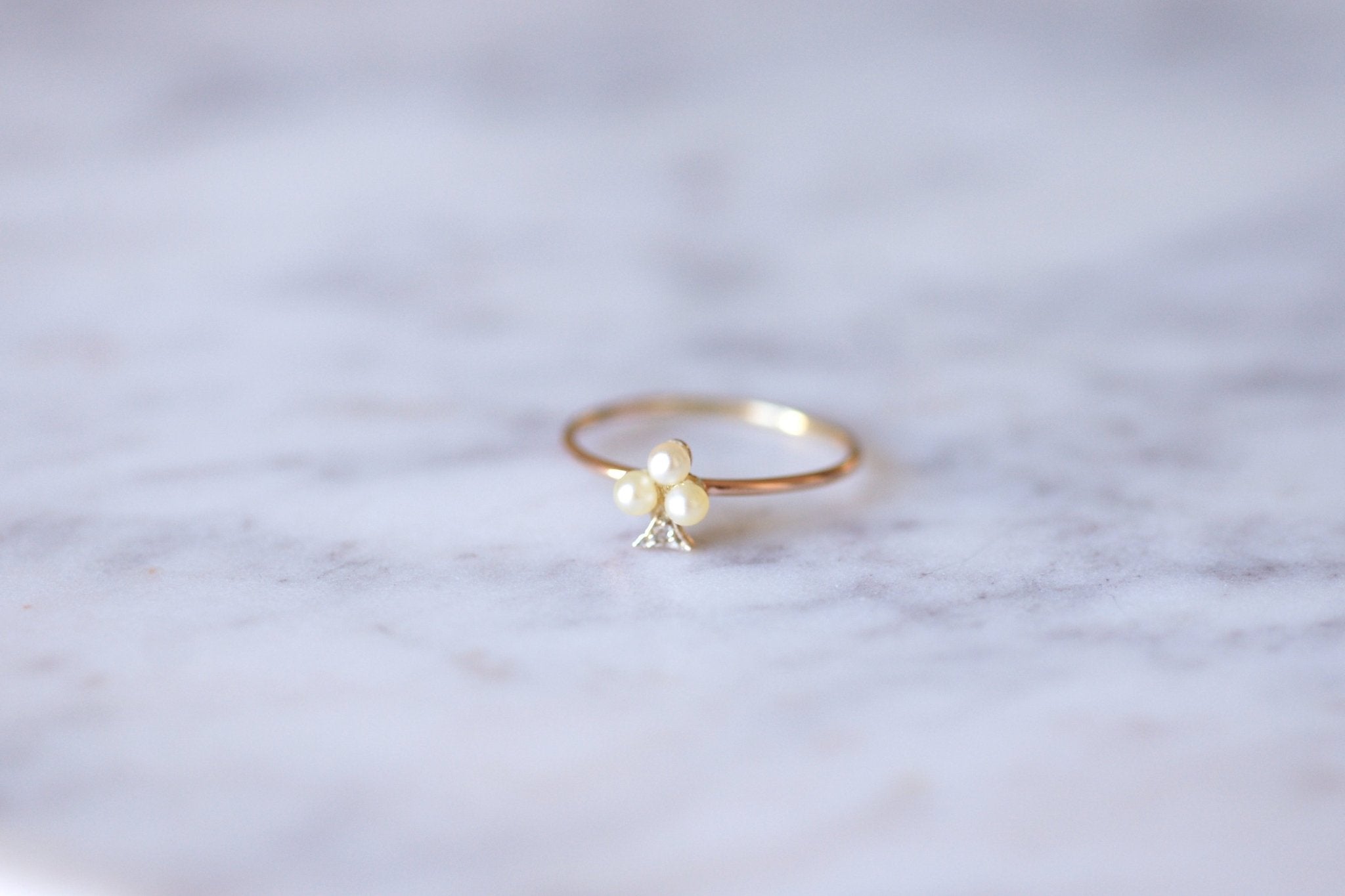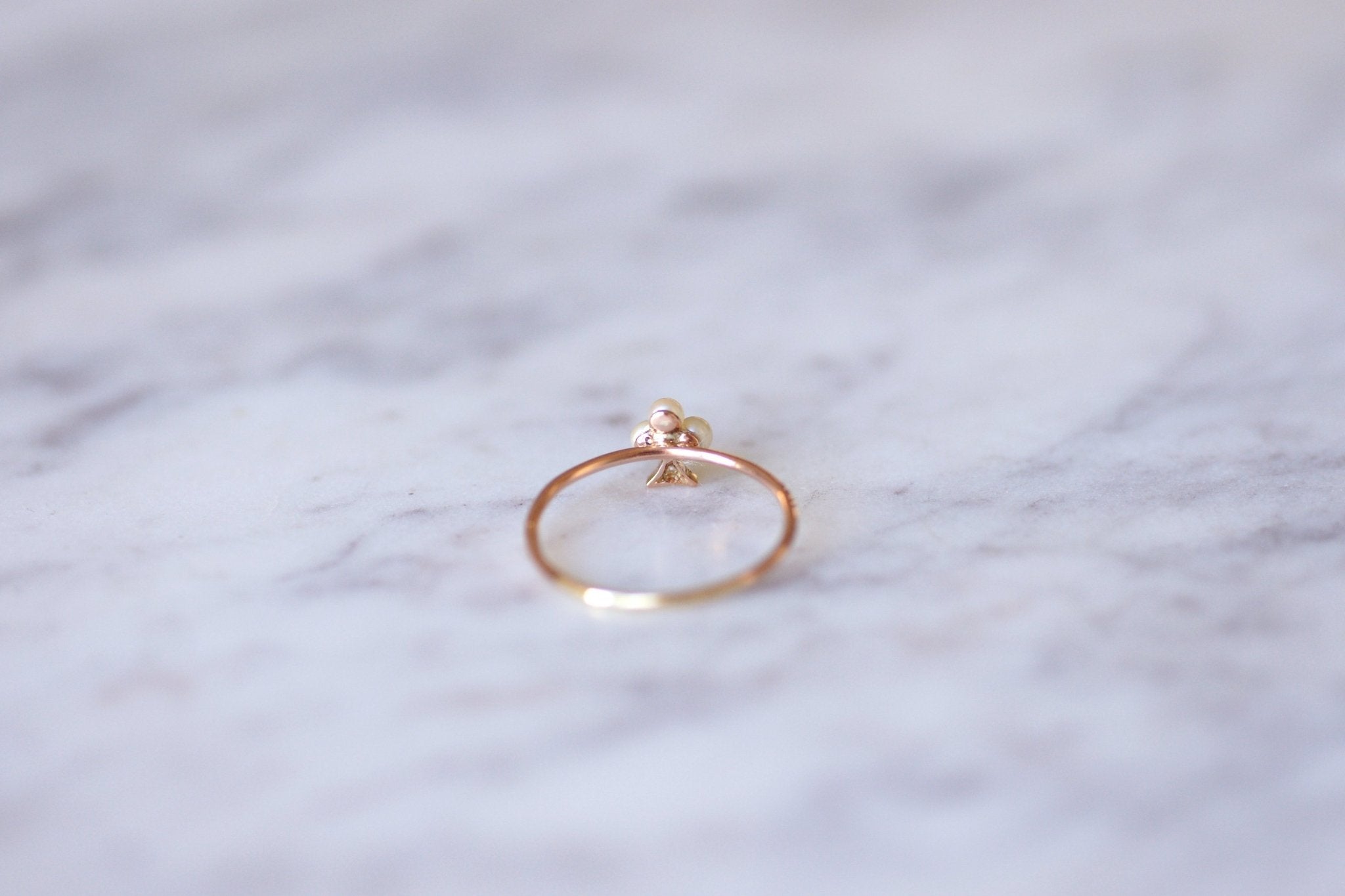 Bague trèfle en or rose 18kt (poinçon tête d'aigle), ornée de trois perles fines et d'un diamant taillé en rose.