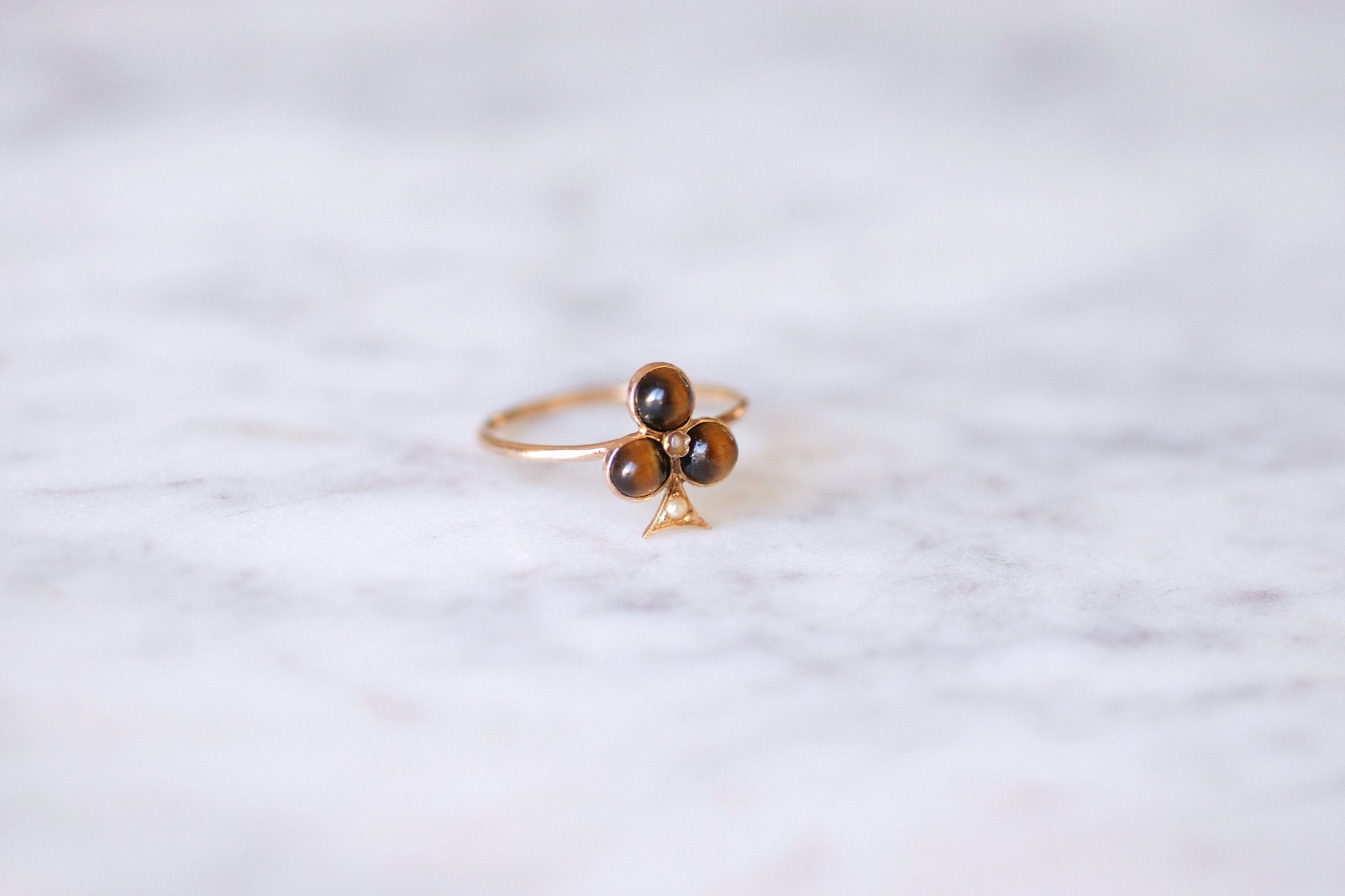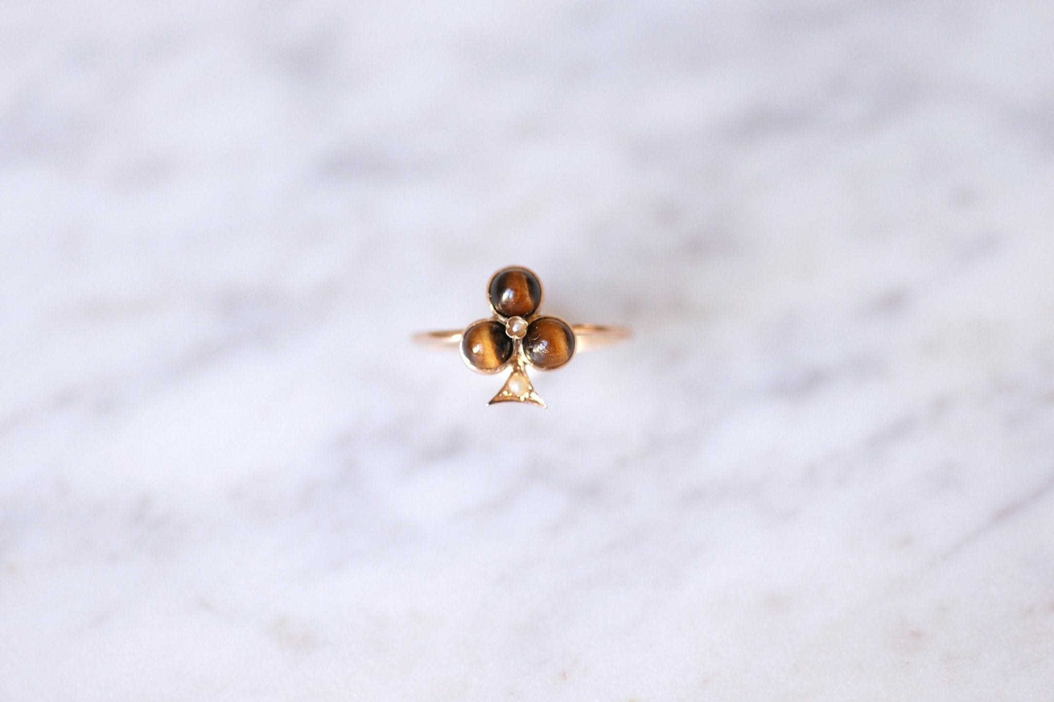 Bague ancienne trèfle or rose, quartz oeil de tigre