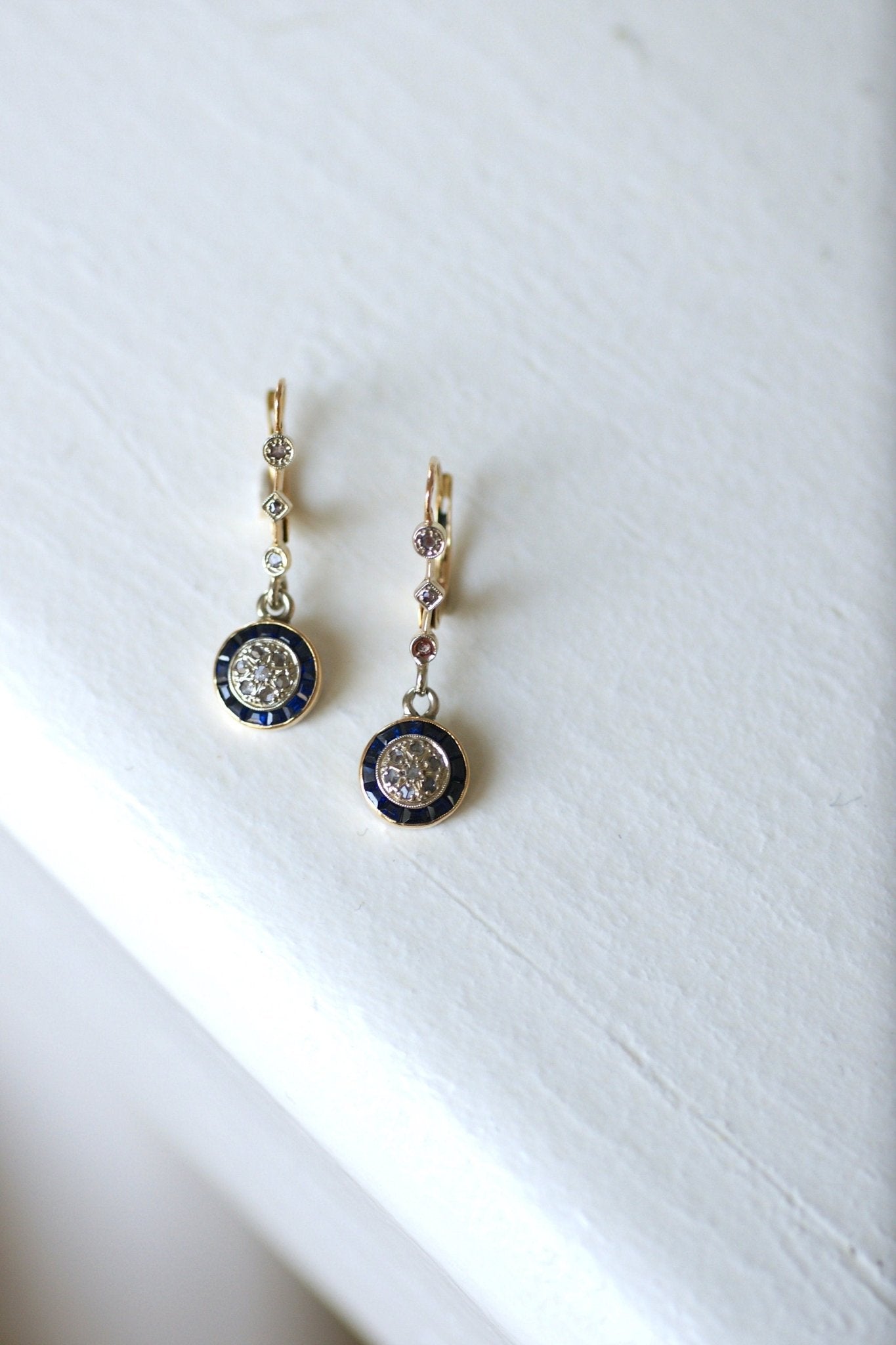 Boucles d'oreilles dormeuses en or jaune et blanc 18kt (poinçons tête d'aigle) ornées de diamants taillés en rose, ainsi que de saphirs synthétiques.