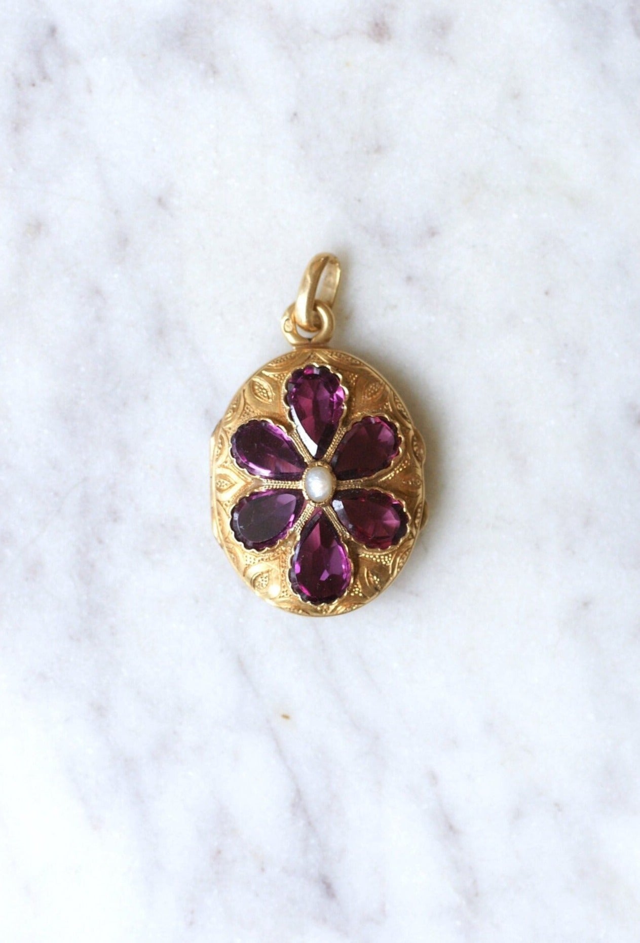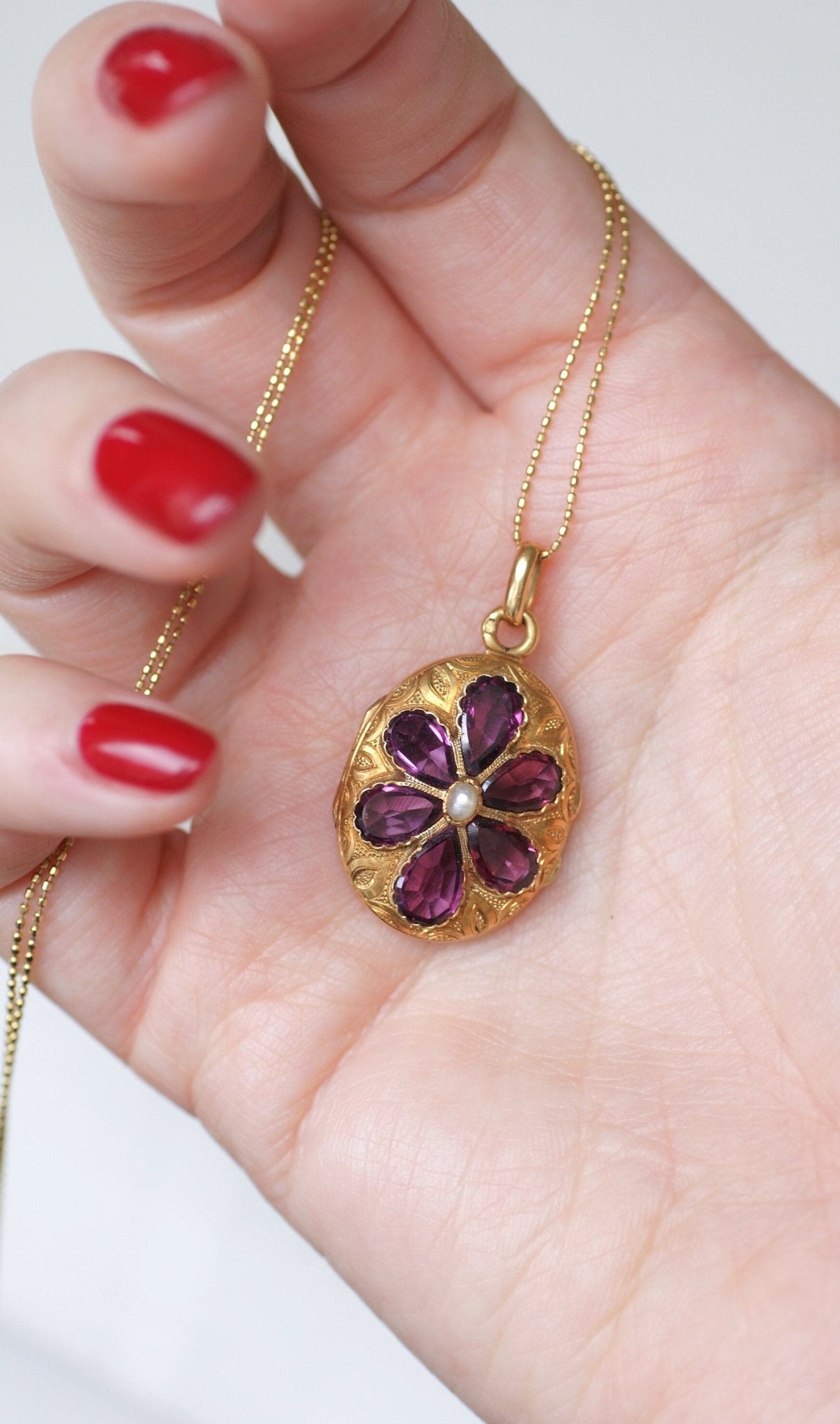 Charmant médaillon ouvrant en or jaune 18Kt (poinçon: tête d'aigle) finement guilloché, et orné en son centre d'une perle probablement fine, dans un entourage de grenats taillés en poire, représentant une fleur.