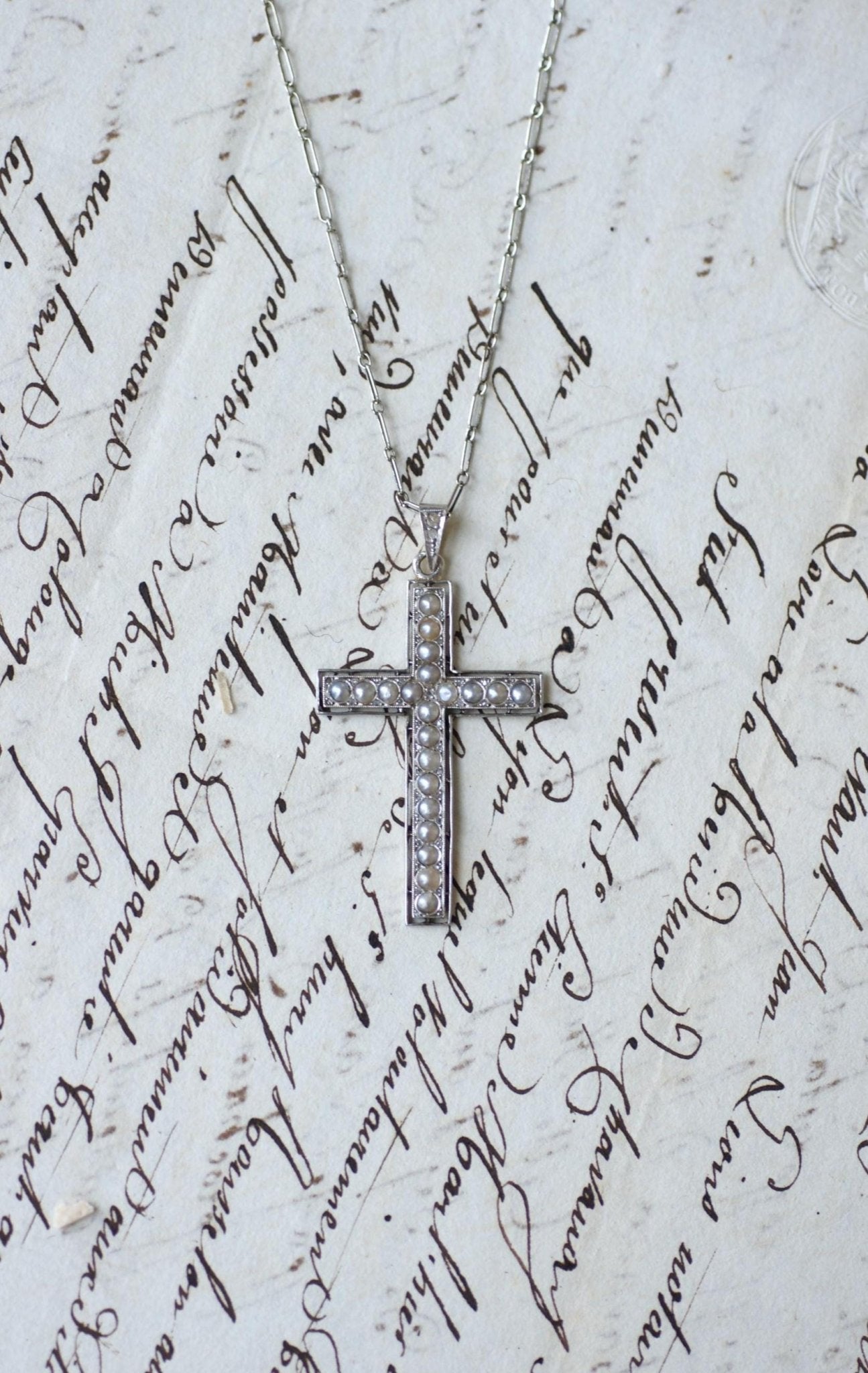 Pendentif croix en or et platine (poinçon: charançon), entièrement sertie de demi perles (probablement fines) et de diamants taillés en rose.