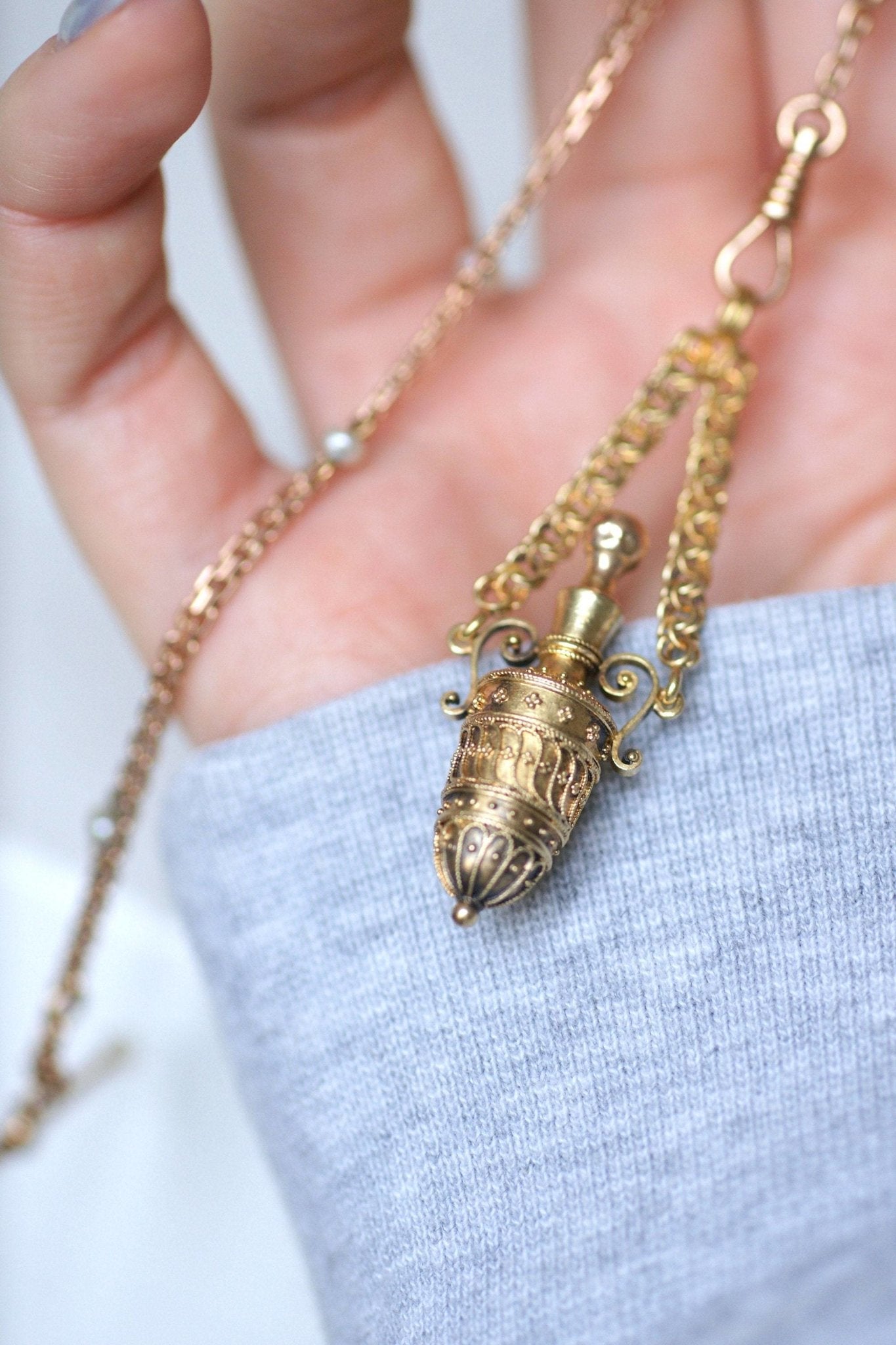 Rare pendentif flacon à sels, vinaigrette, ouvrant en or jaune 14Kt (poinçon : coquille Saint-Jacques), en forme d'amphore délicatement filigranée.