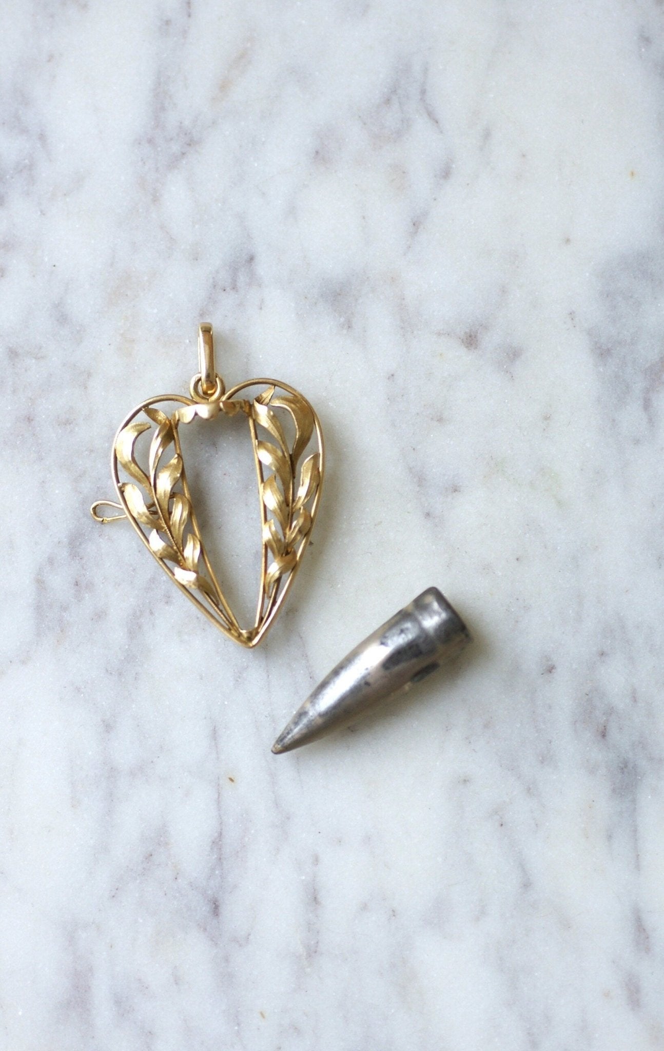 Cœur en or jaune 18Kt (poinçon: tête de cheval) présentant en son centre un projectile d'arme à feu entouré de feuilles finement ciselées.