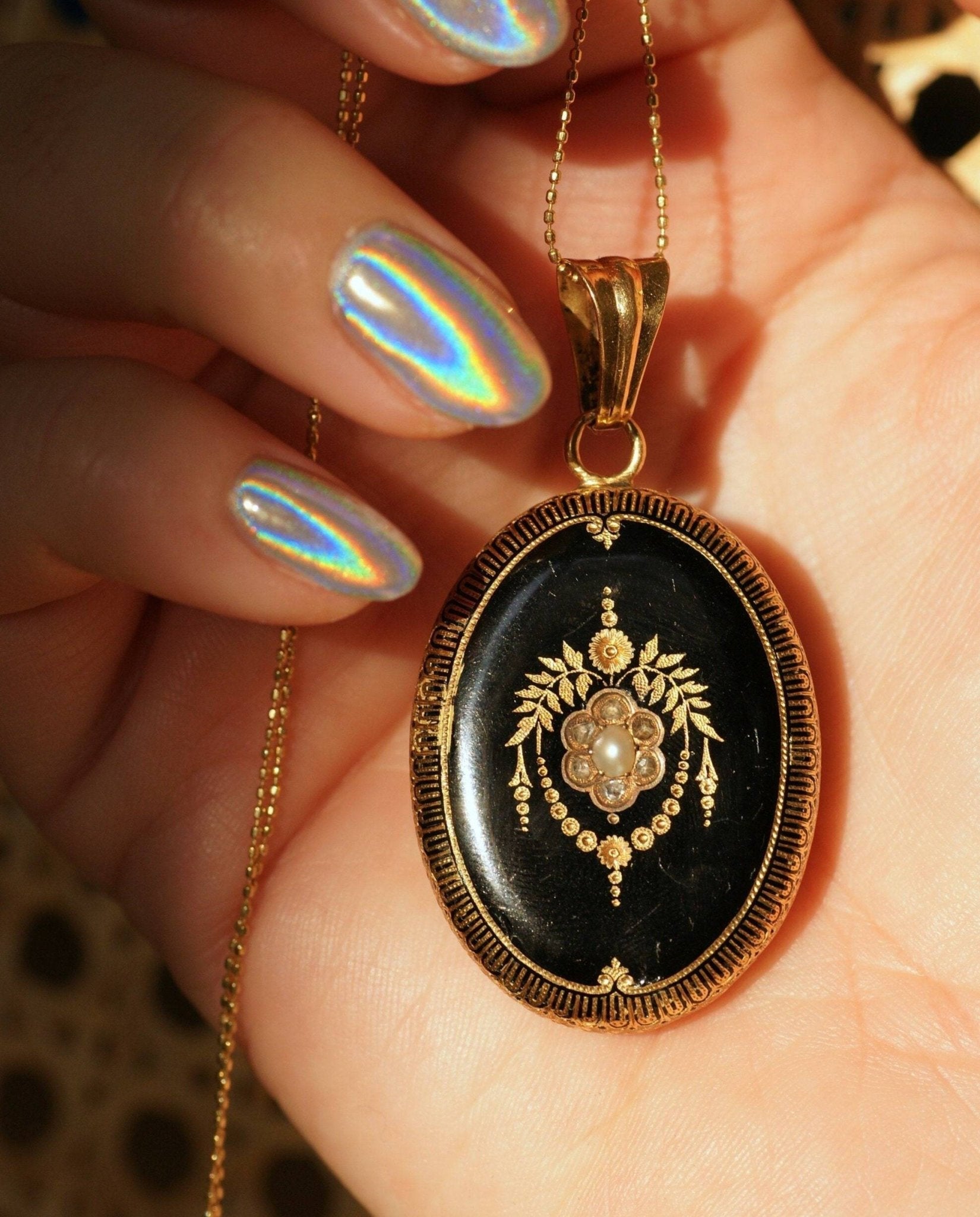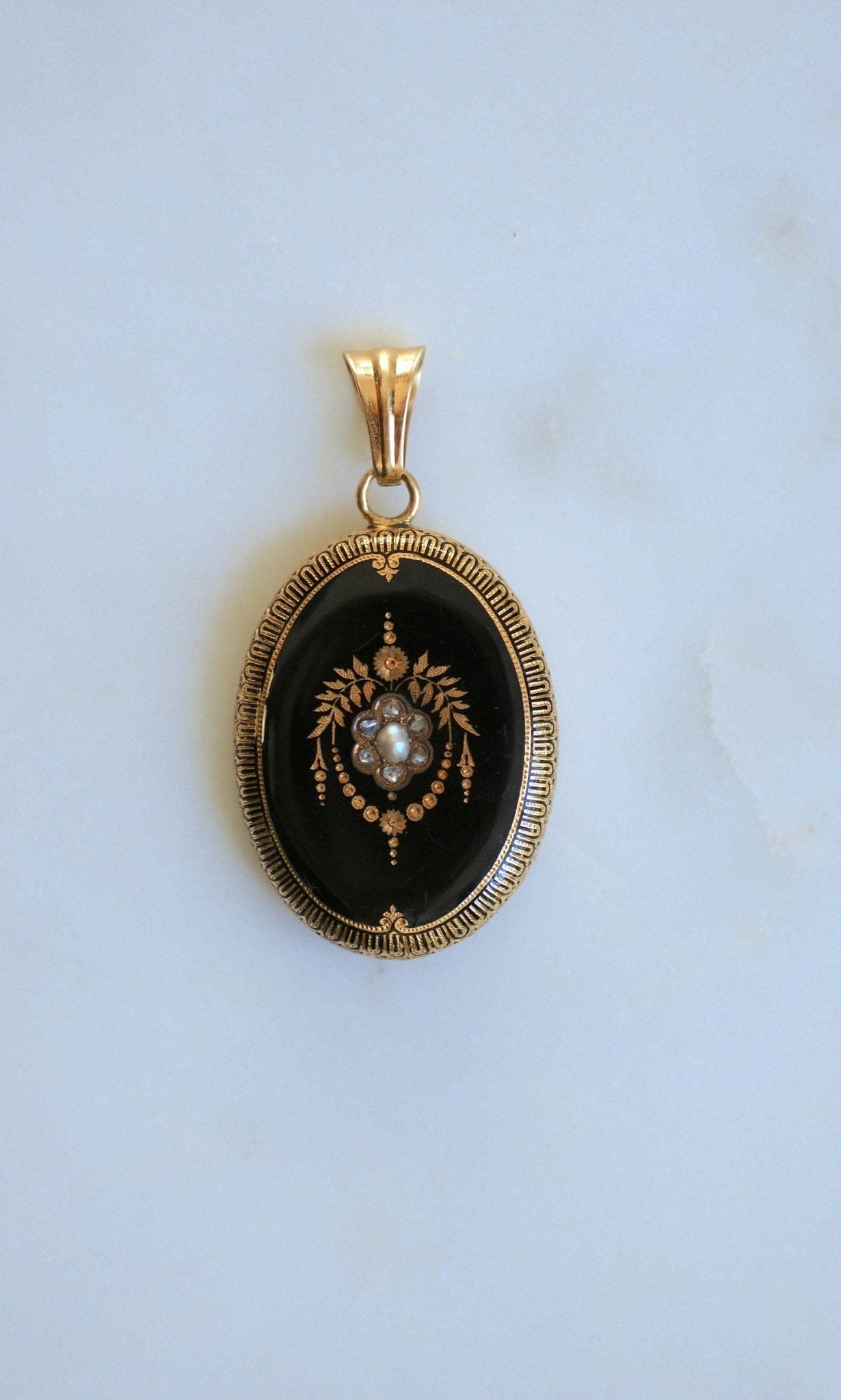 Pendentif médaillon ancien en or, émail noir, perle fine, diamants