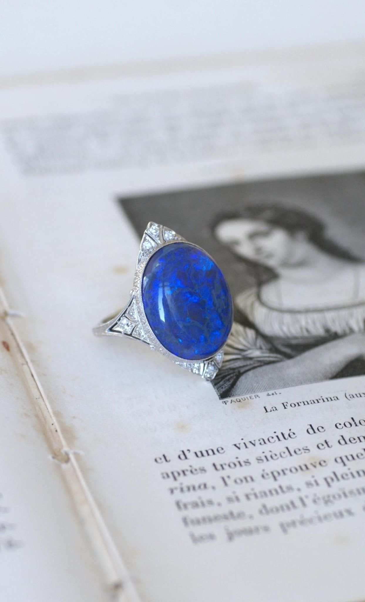 Bague Art Deco Opale Noire et Diamants sur Platine