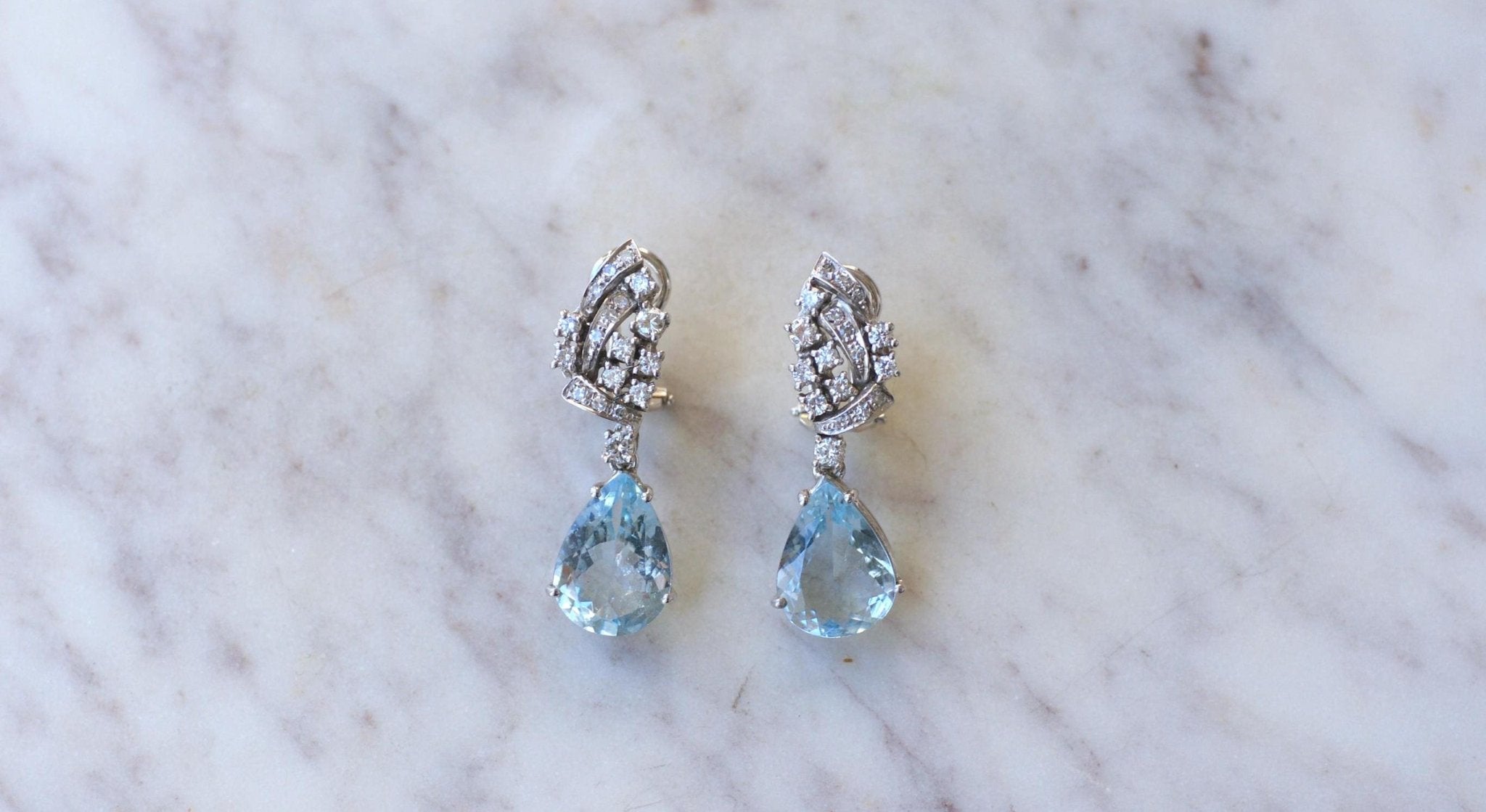 Boucles d'Oreilles Goutte Aigue Marine et Diamant