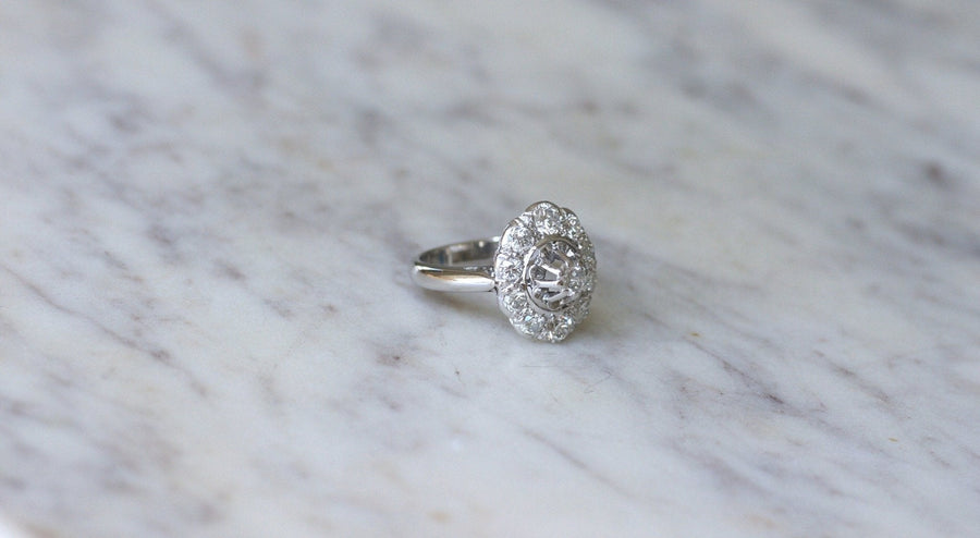 Bague de fiançailles, marguerite ovale en or blanc 18Kt (poinçon : hibou), sertie en son centre d'un diamant demi taille, dont le poids est estimé à environ 0,20 Ct (couleur estimée H, pureté estimée VS), dans un entourage de diamants demi taille, dont le poids total est estimé à environ 1.00 Ct.