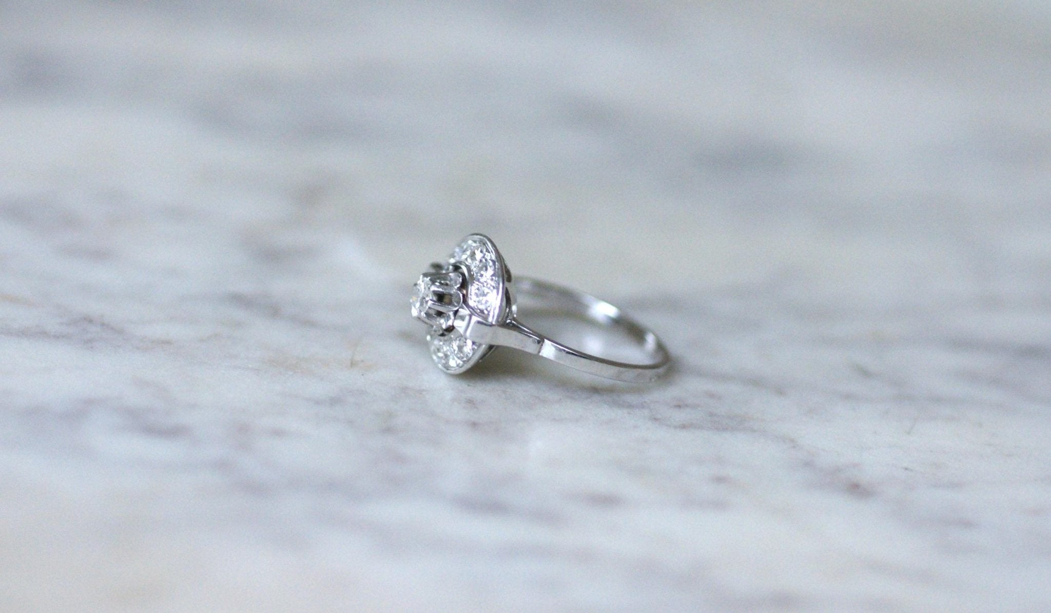 Bague cible en or blanc 18Kt et platine (poinçon: tête d'aigle et de chien), dont le centre est orné d'un diamant taille moderne, dont le poids est estimé à environ 0,20 Ct (couleur estimée H, pureté estimée VS), dans un entourage de diamants taillés en 8x8, dont le poids total est estimé à environ 0.40Ct.