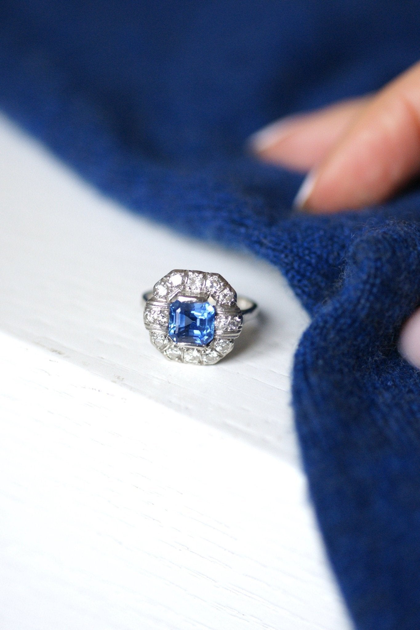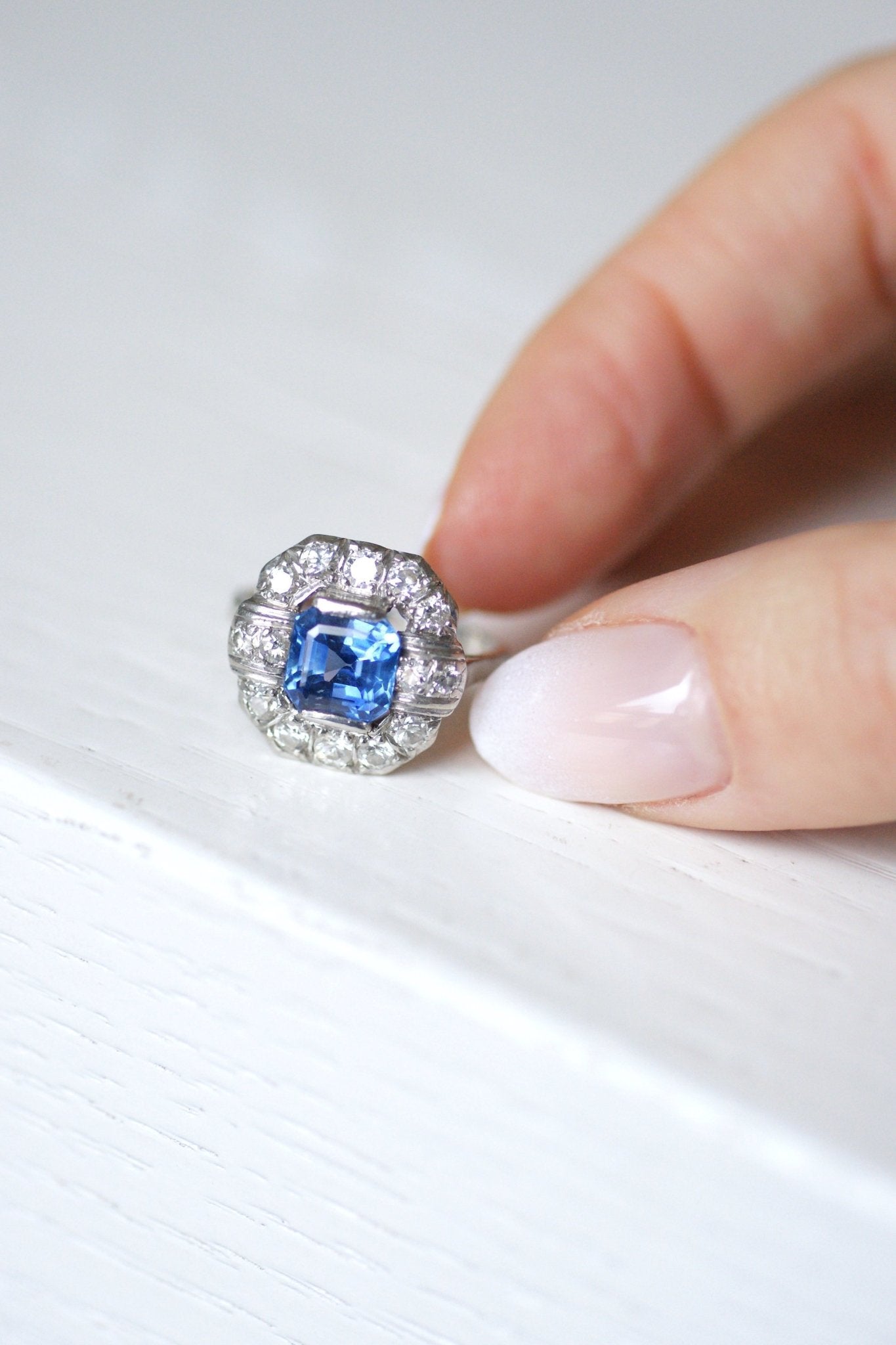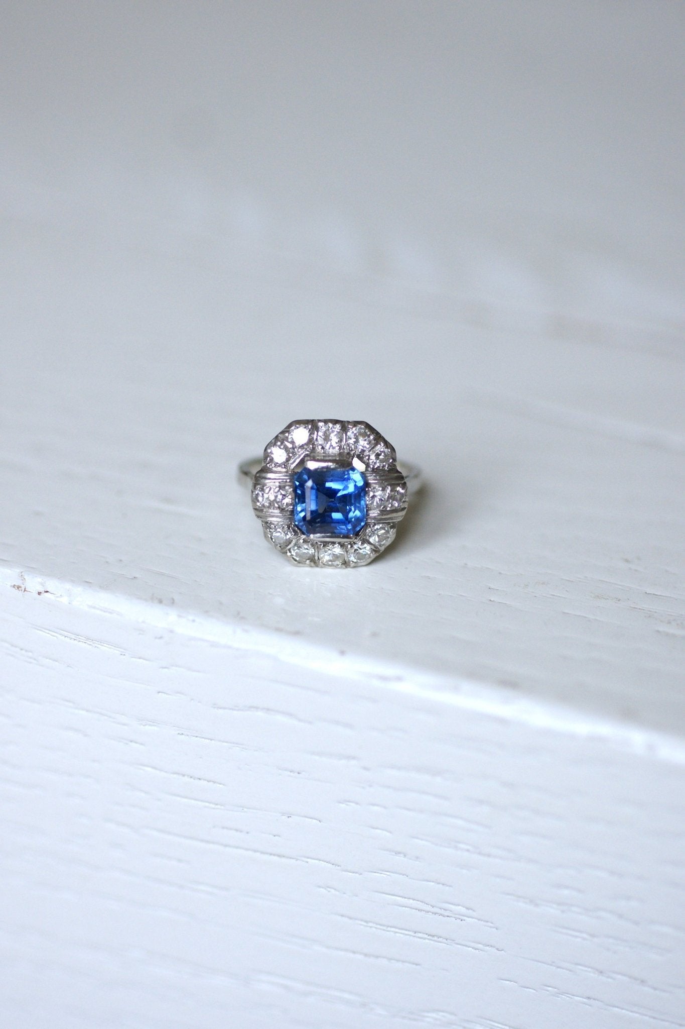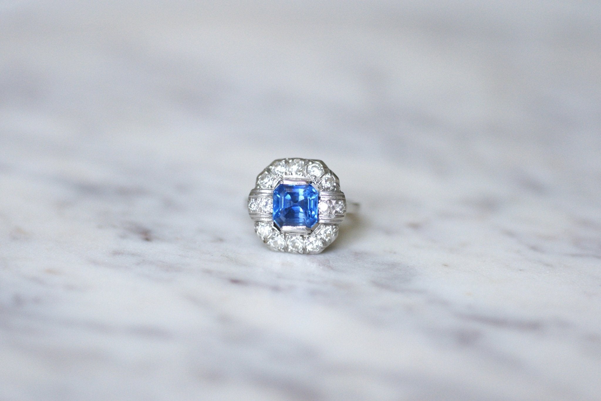 Bague de fiançailles Art Déco en platine (poinçons: Mascaron), dont le centre est orné d'un saphir carré à pans coupés pesant 2.57 Cts, dans un entourage de diamants demi-taille.