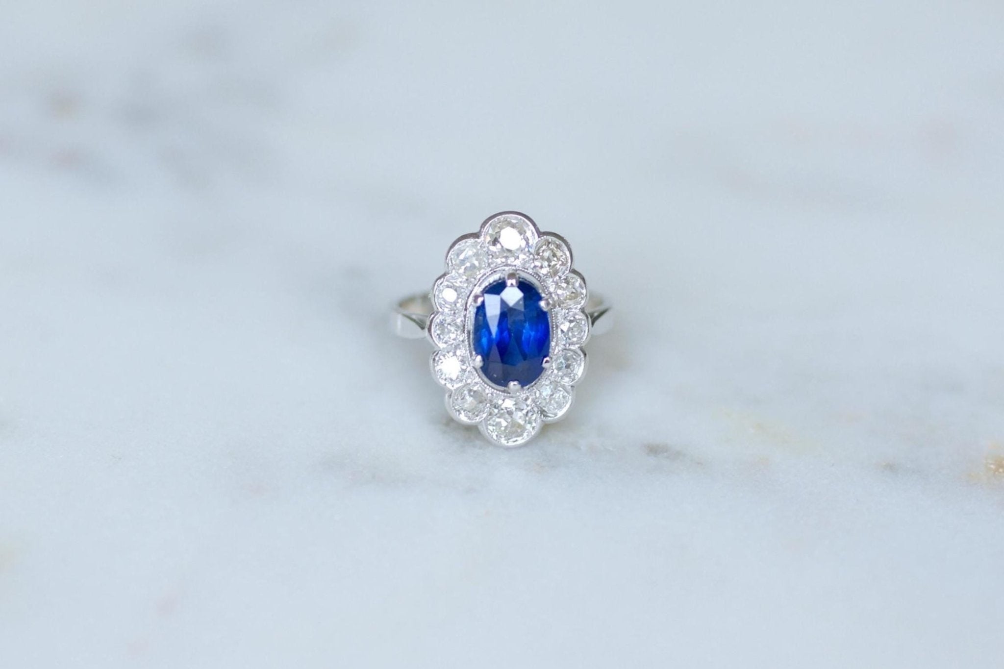 Bague Marguerite Art Deco Saphir Ceylan 1,90 Cts et Diamants