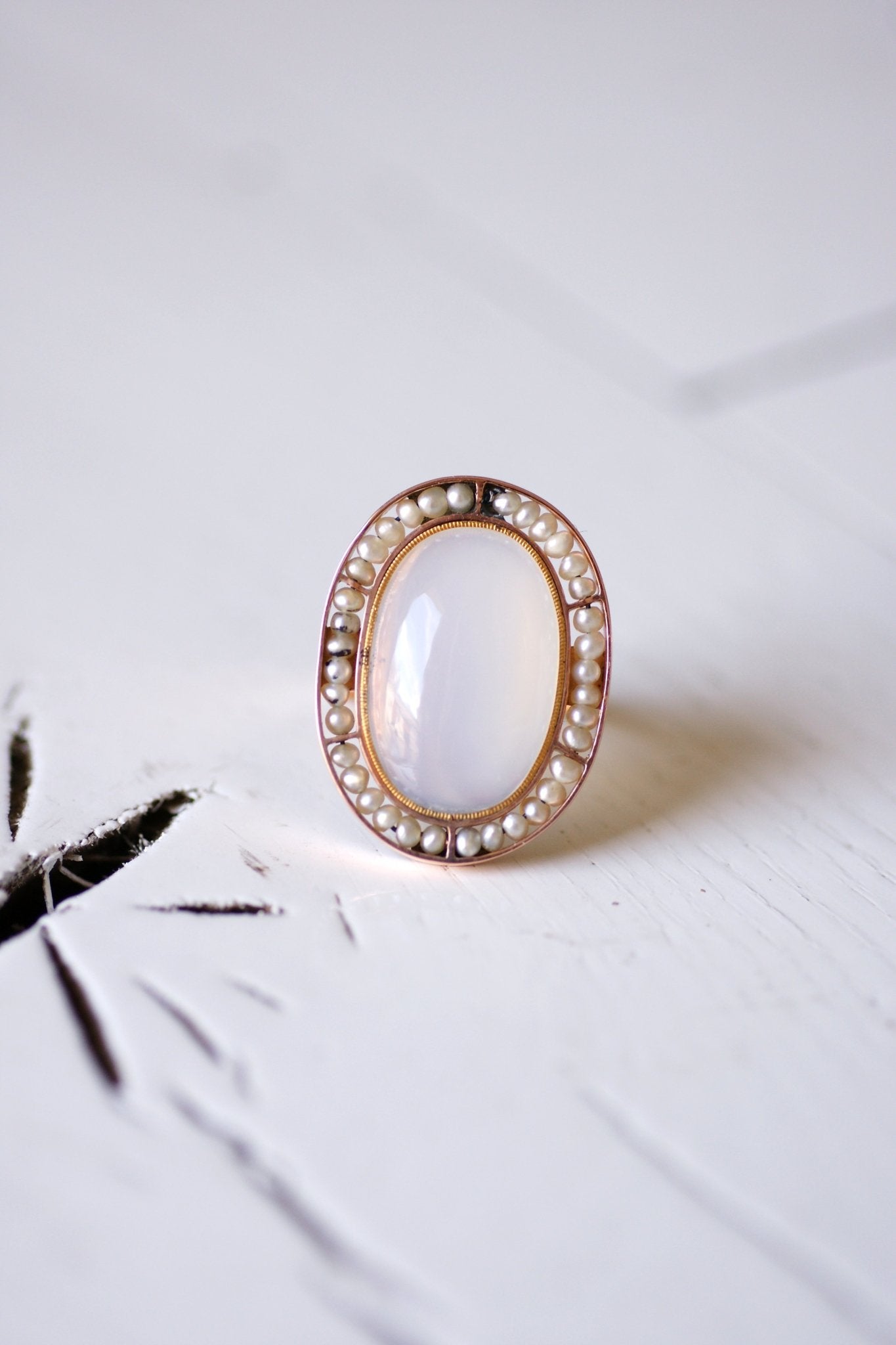 Bague ancienne or rose calcédoine bleu gris adularescente et perles