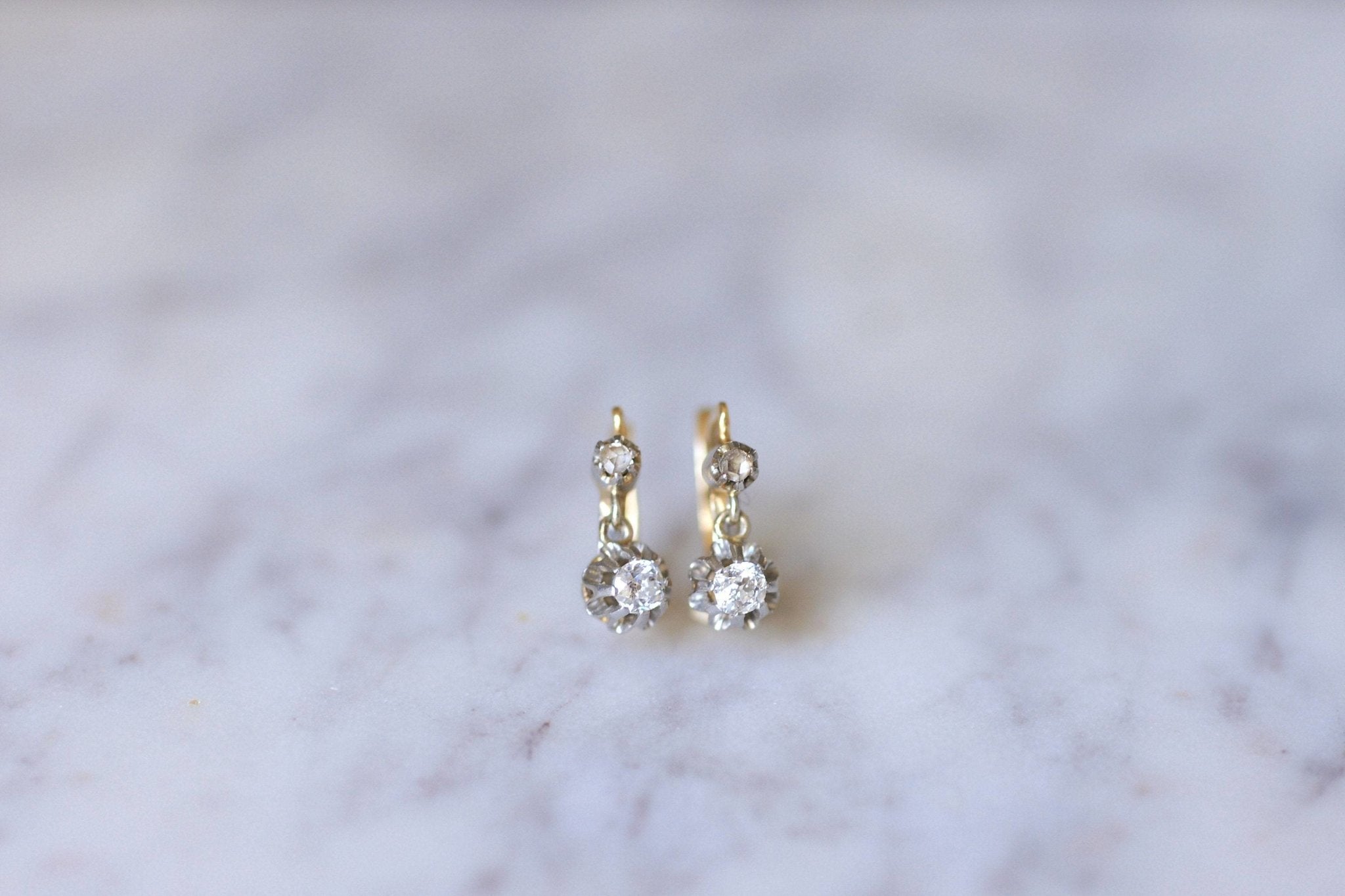 Boucles d'oreilles dormeuses en or jaune 18kt et platine (poinçon tête d'aigle) ornées de deux diamants taillés à l'ancienne (poids total est estimé à environ 0,40 Ct, couleur estimée H / Pureté estimée SI) sur chaton gaufré articulé, surplombés de deux petits diamants taillés en rose.
