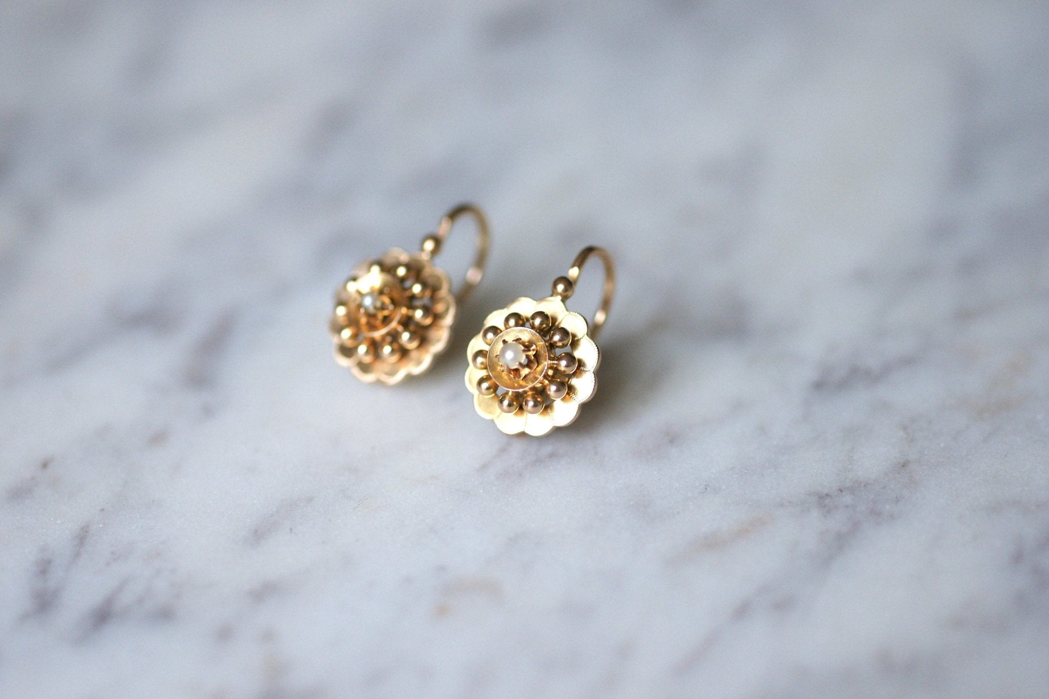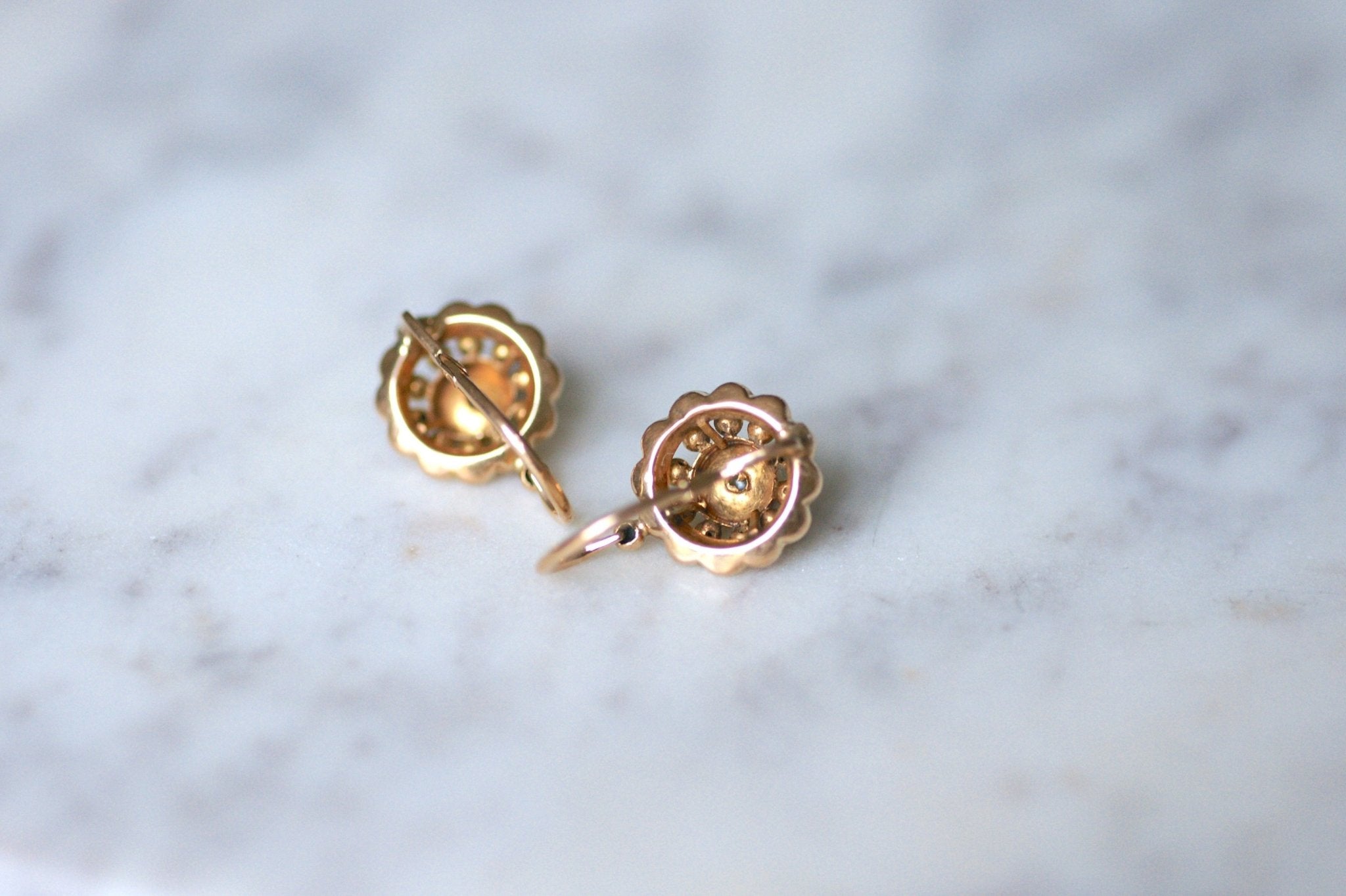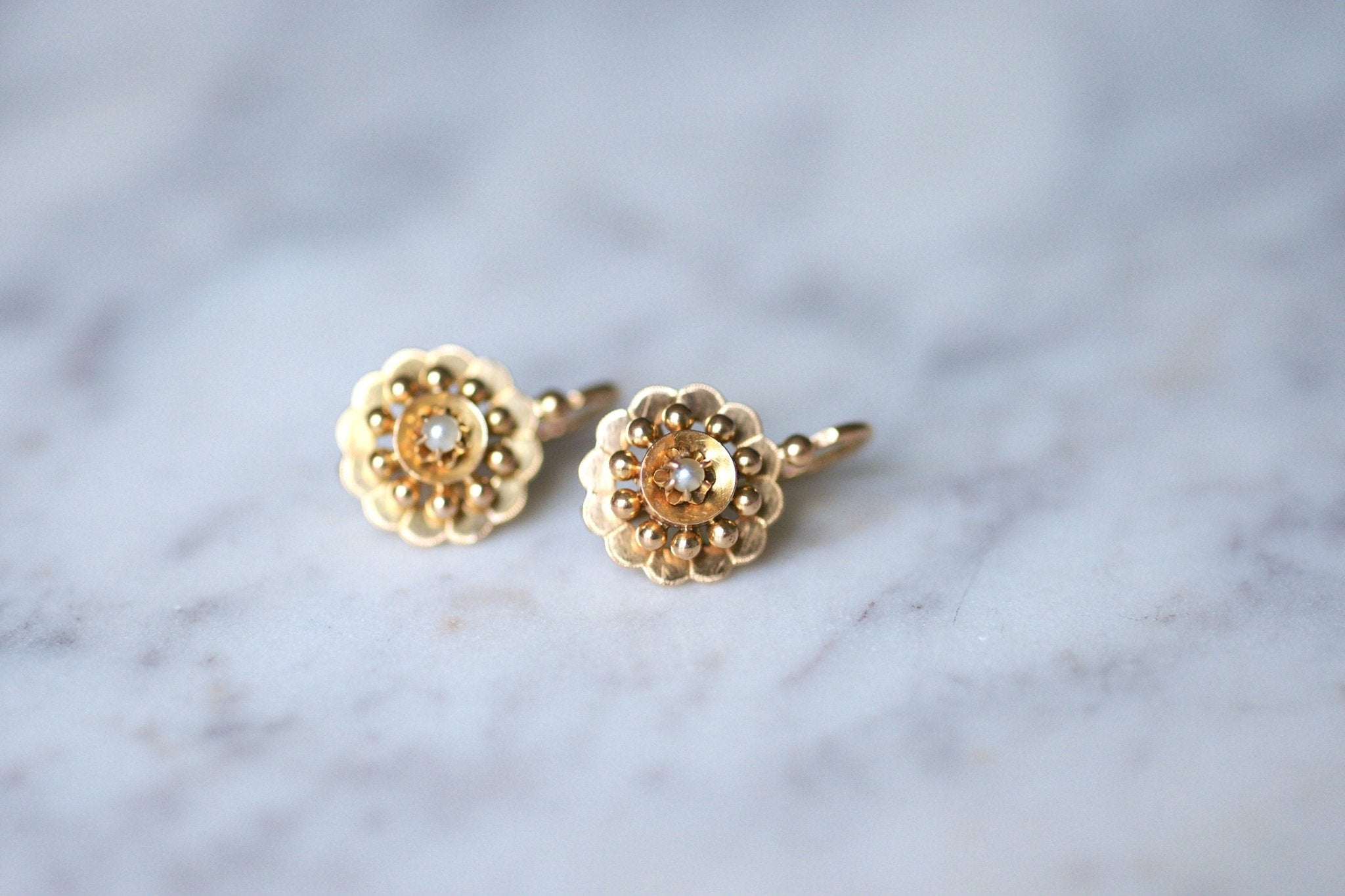 Boucles d'oreilles fleurs dormeuses anciennes en or rose et perle