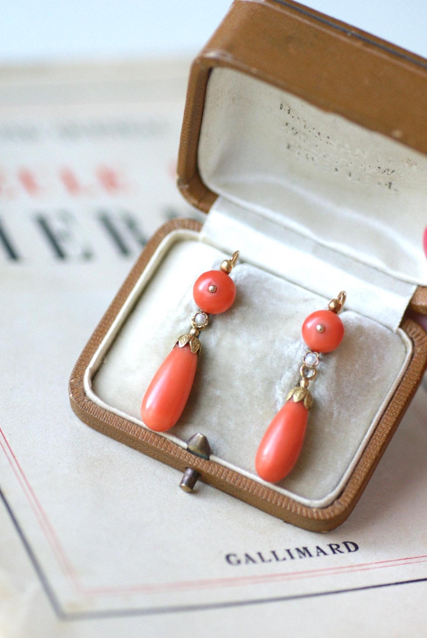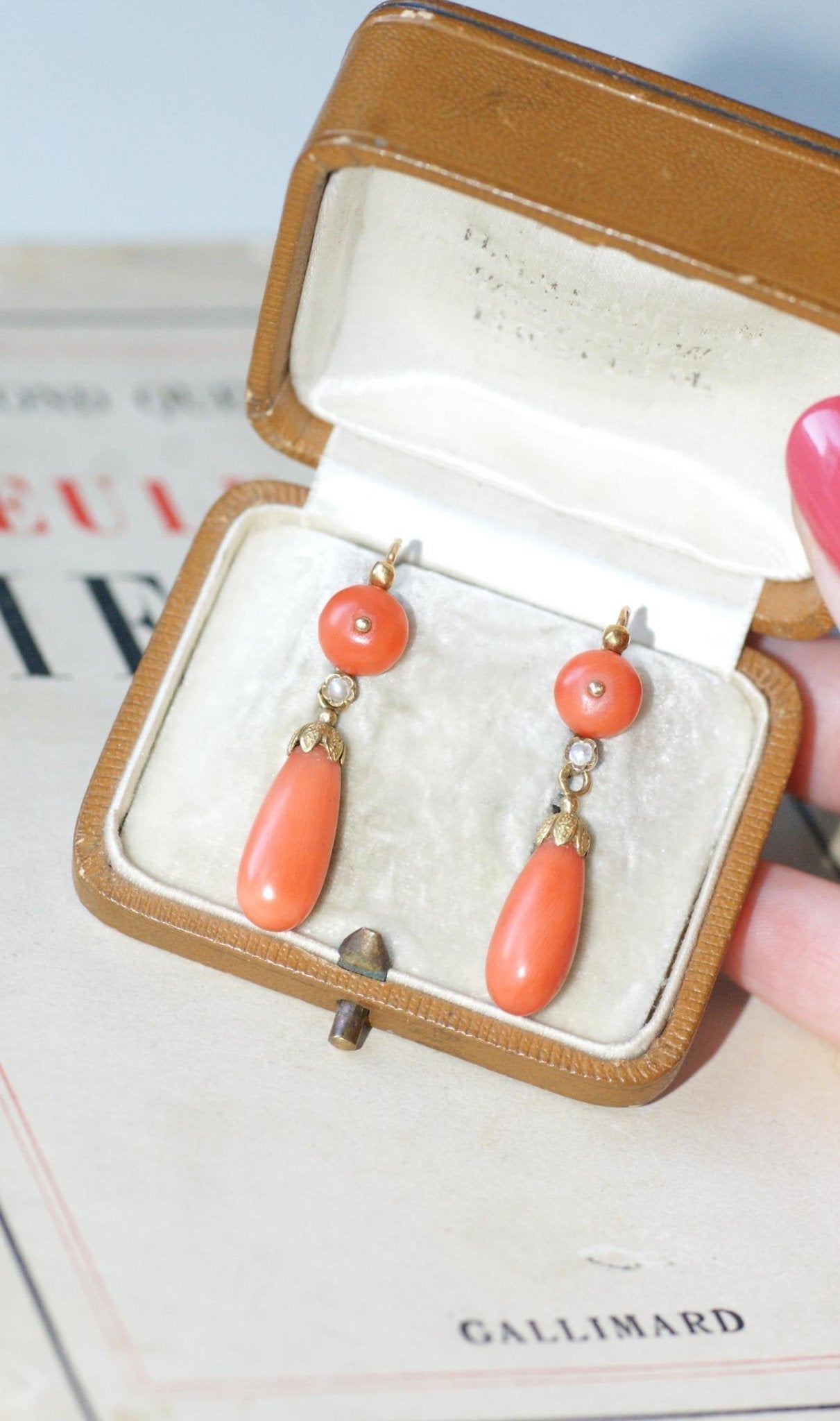 Boucles d'oreilles pendantes en or jaune 18kt (poinçon : tête d'aigle) ornées d'un bouton de corail retenant en pampille une goutte de corail, surmontée d'une petite perle fine.