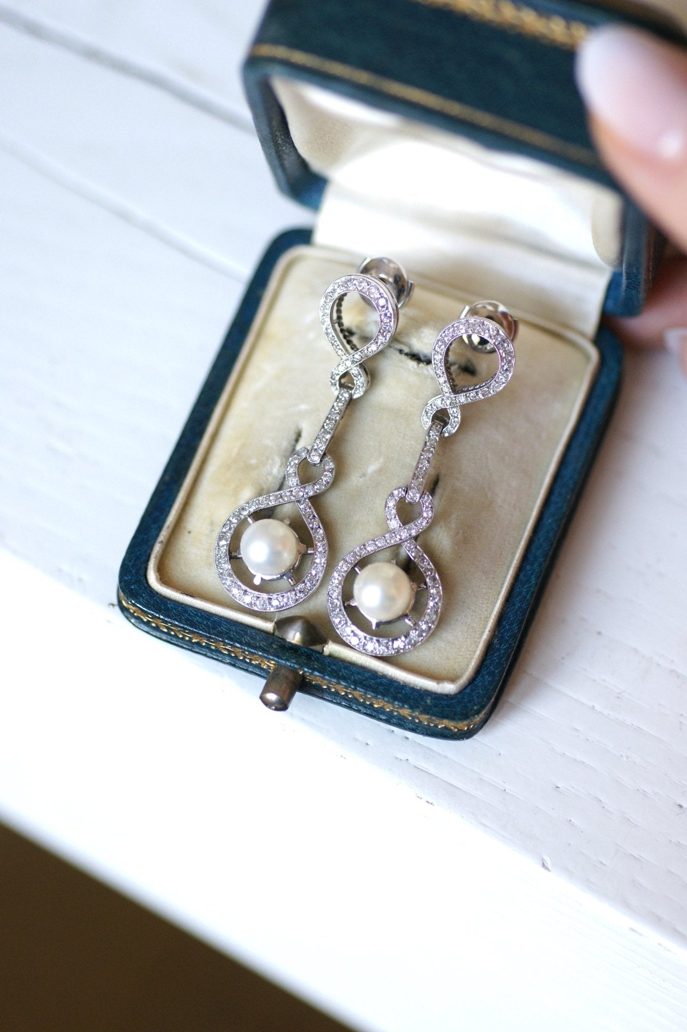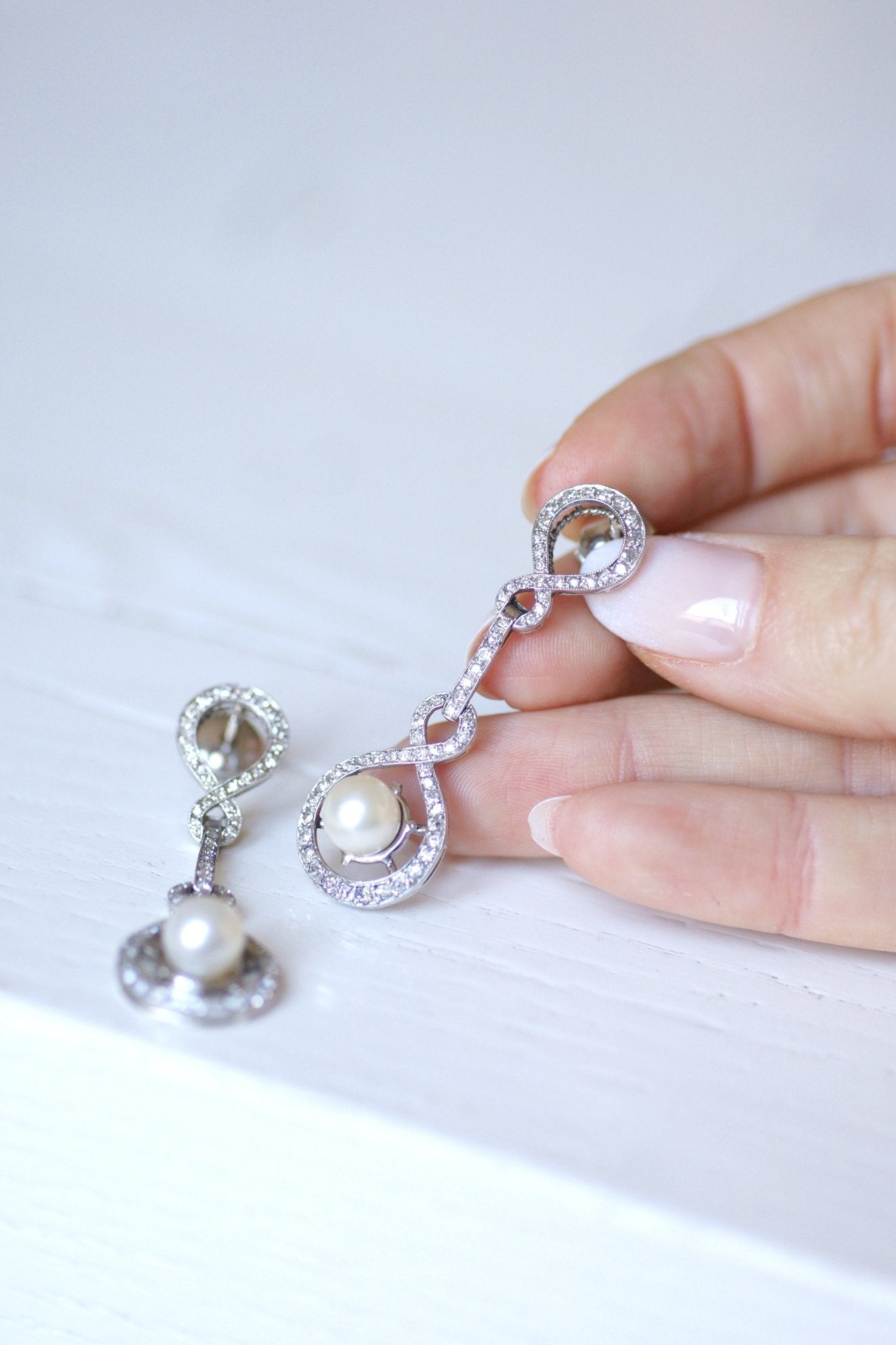 Boucles d'oreilles gouttes style Art Déco, platine, diamants, et perles