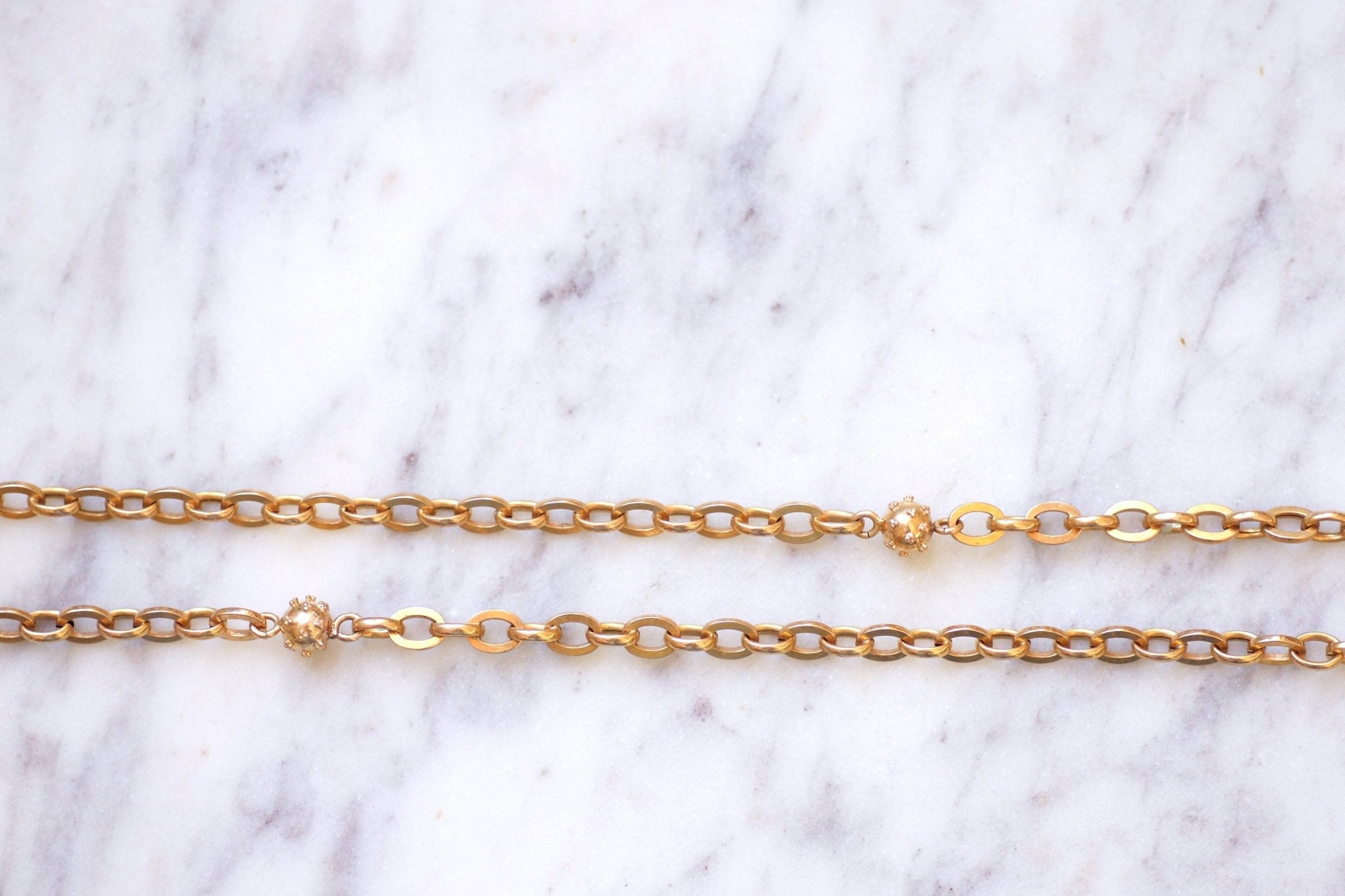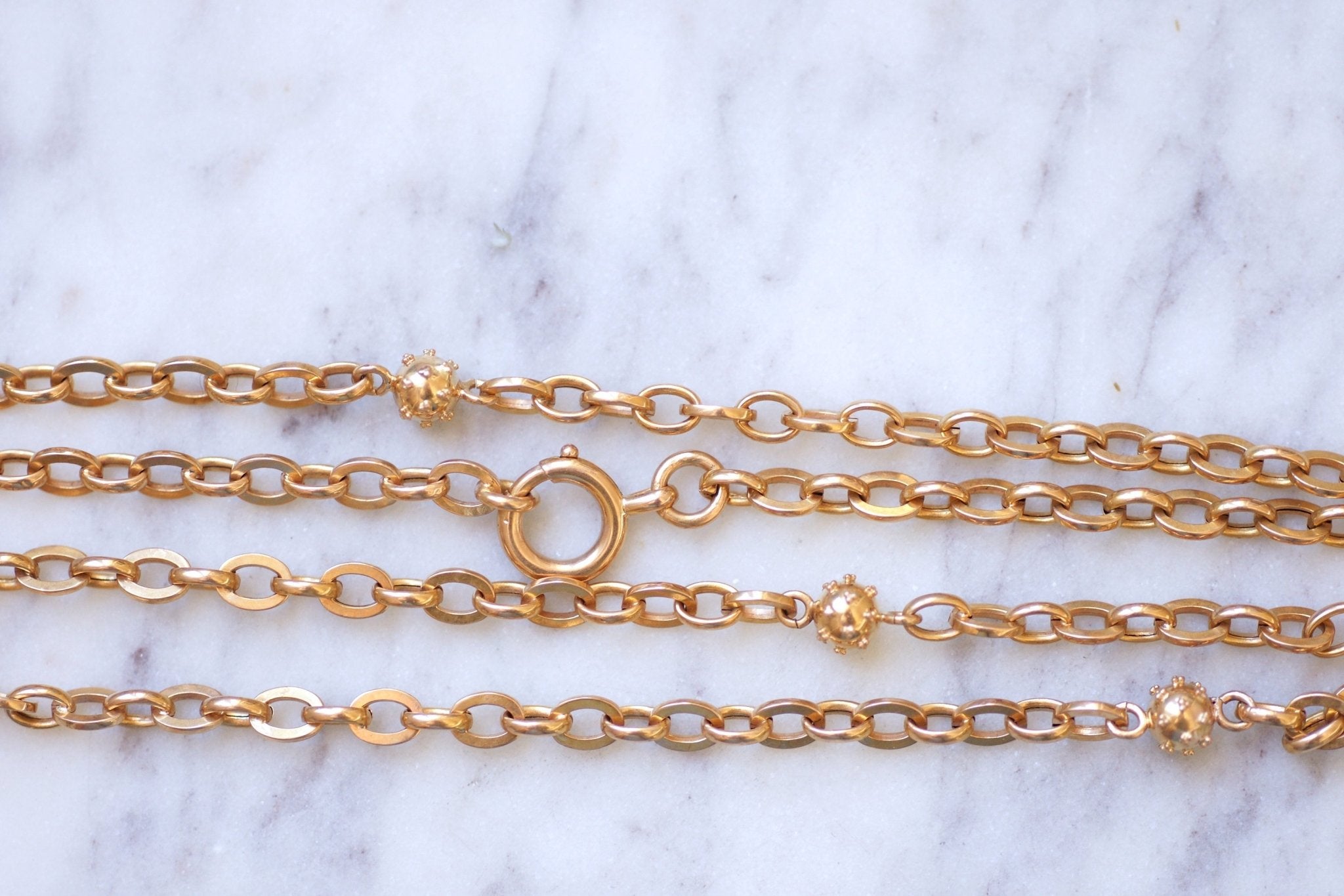 Superbe sautoir, longue chaine maille jaseron ancienne, en or rose 18Kt (poinçon: hibou), orné de délicates boules d'or.